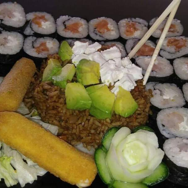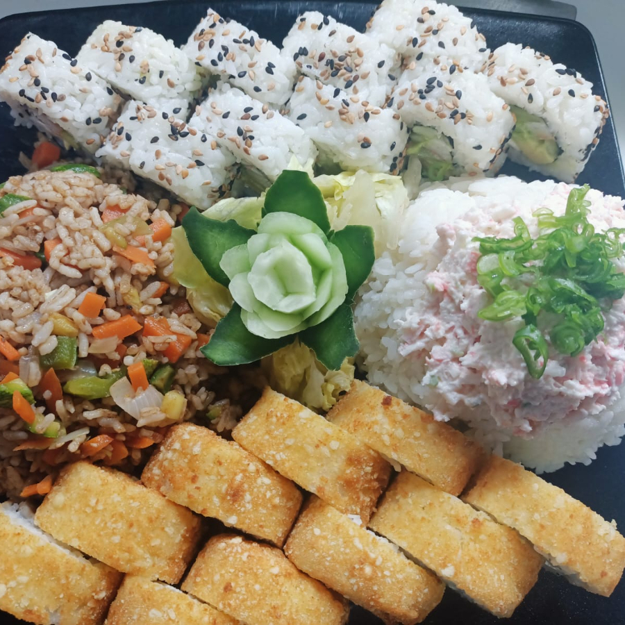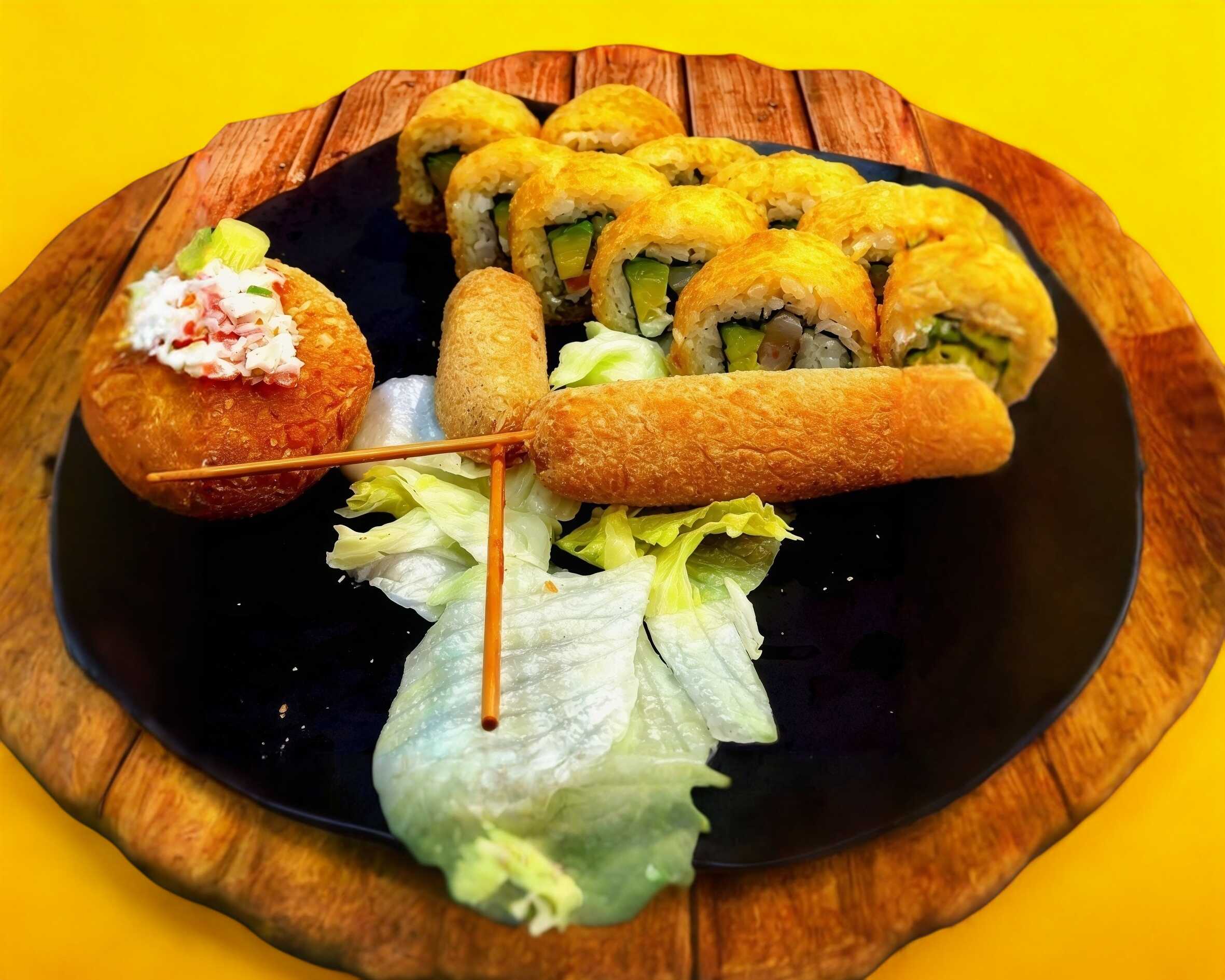 "Dos rollos: uno de cangrejo con queso y aguacate, y otro de camarón con masago, aguacate y queso. Dos nigiris: uno de salmón y otro de camarón. Tres onigiris con tampico. Los rollos pueden ser fríos o empanizados."