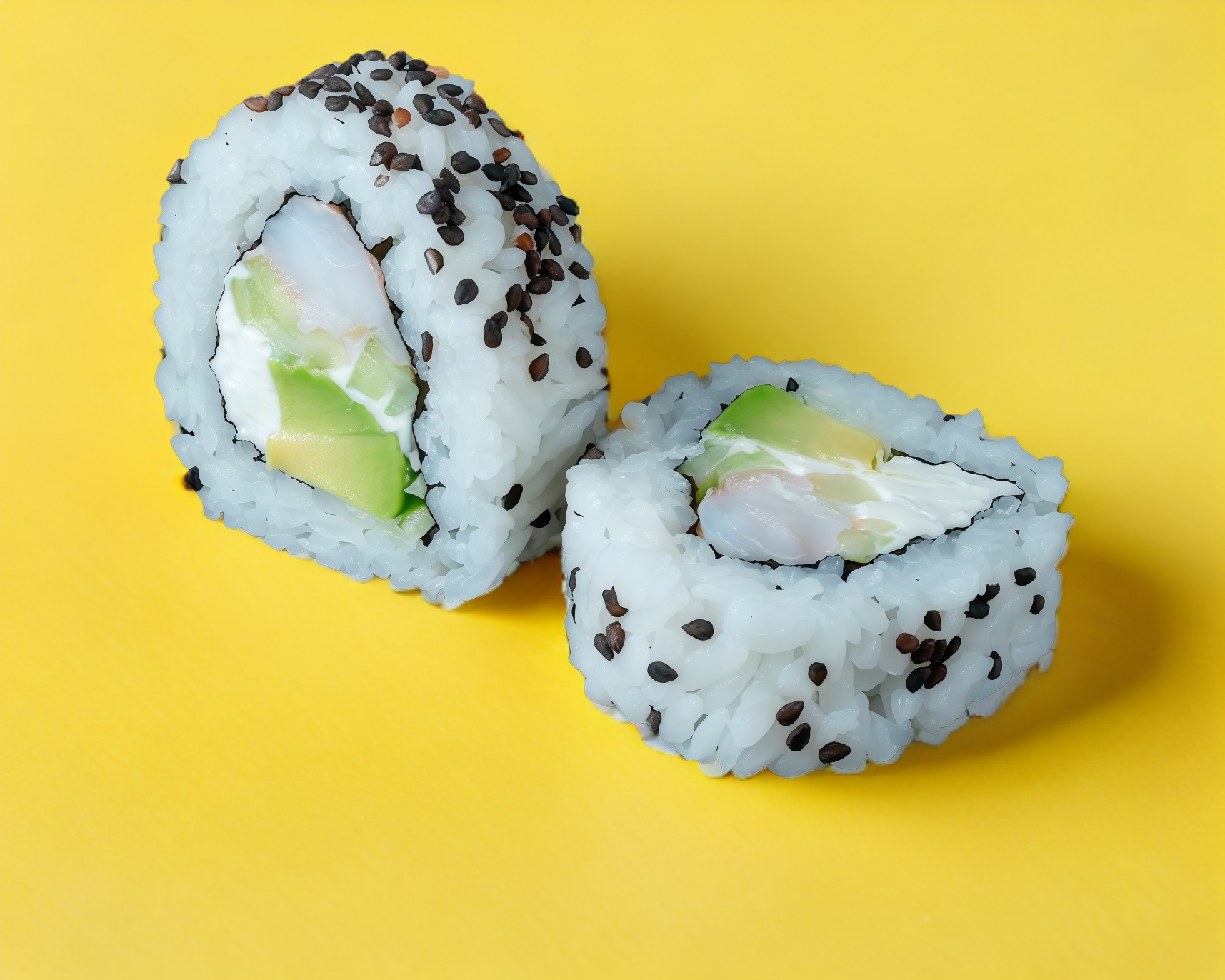 Rollo frio de arroz relleno de queso crema, aguacate, pepino y cangrejo surimi.