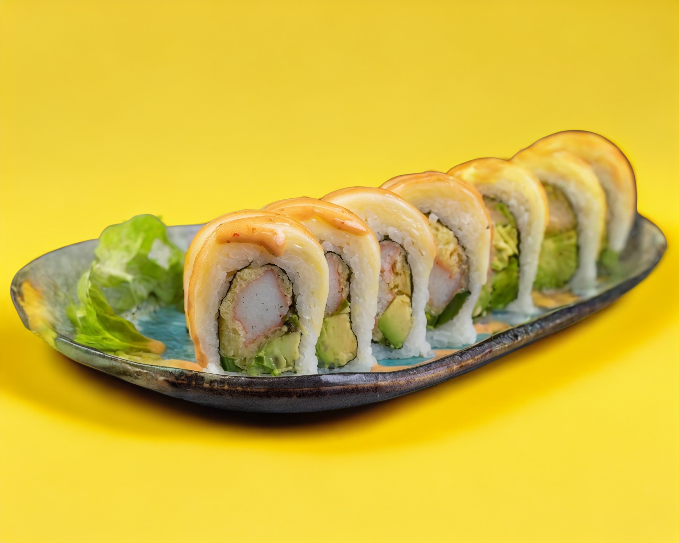 Rollo Cubierto de Queso relleno de aguacate, pepino y cangrejo surimi.
