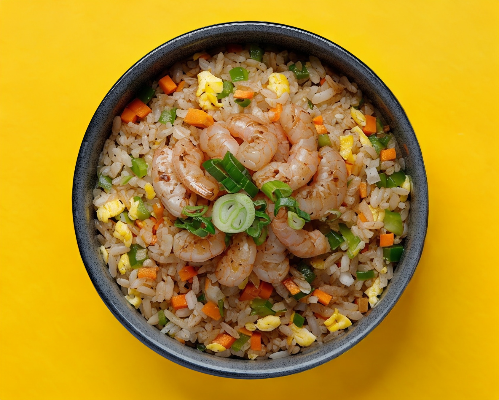 Arroz frito con verduras calabaza, zanahoria, pimiento morrón, huevo y camarón