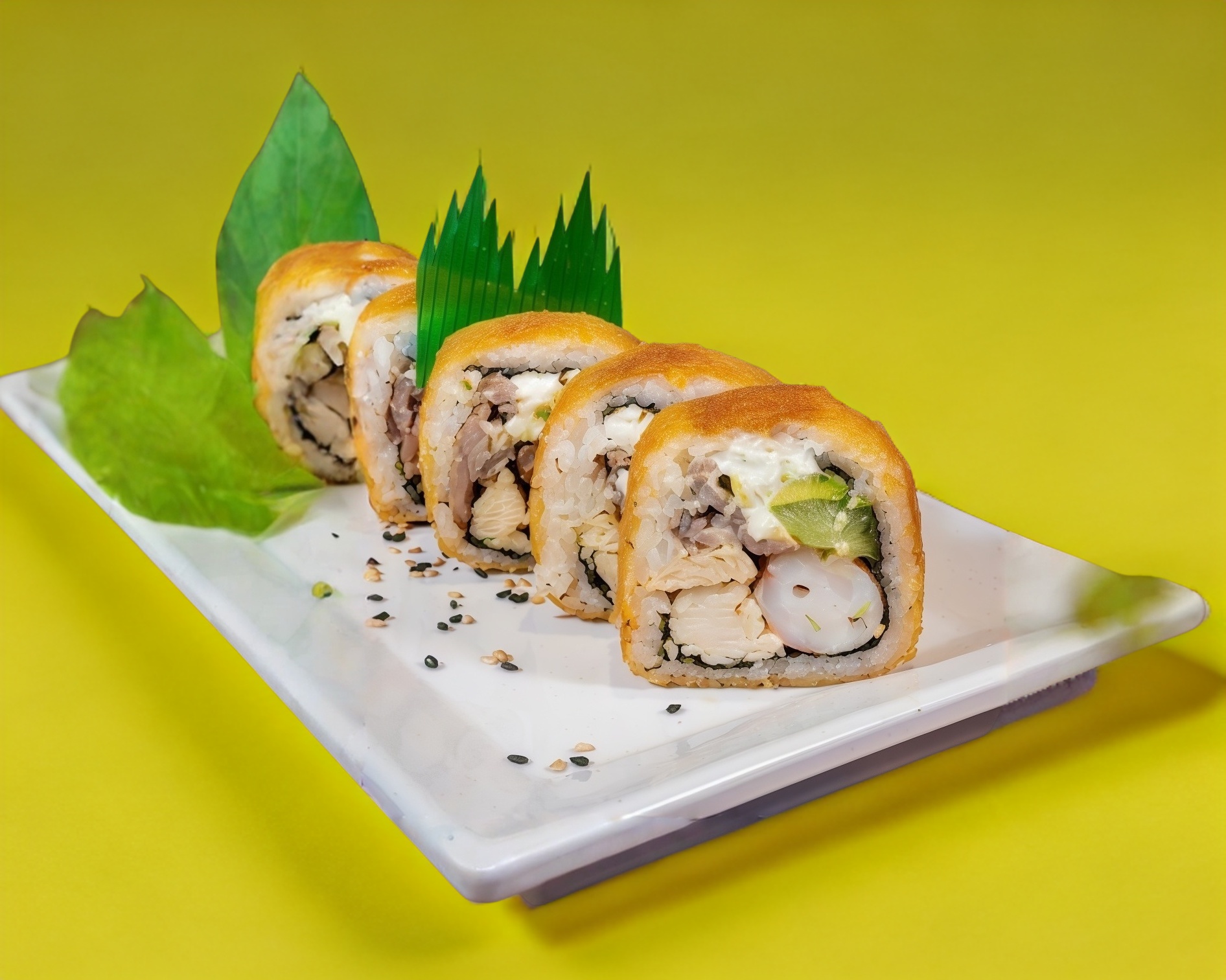 Rollo frito de arroz relleno de queso crema, aguacate y pollo.
