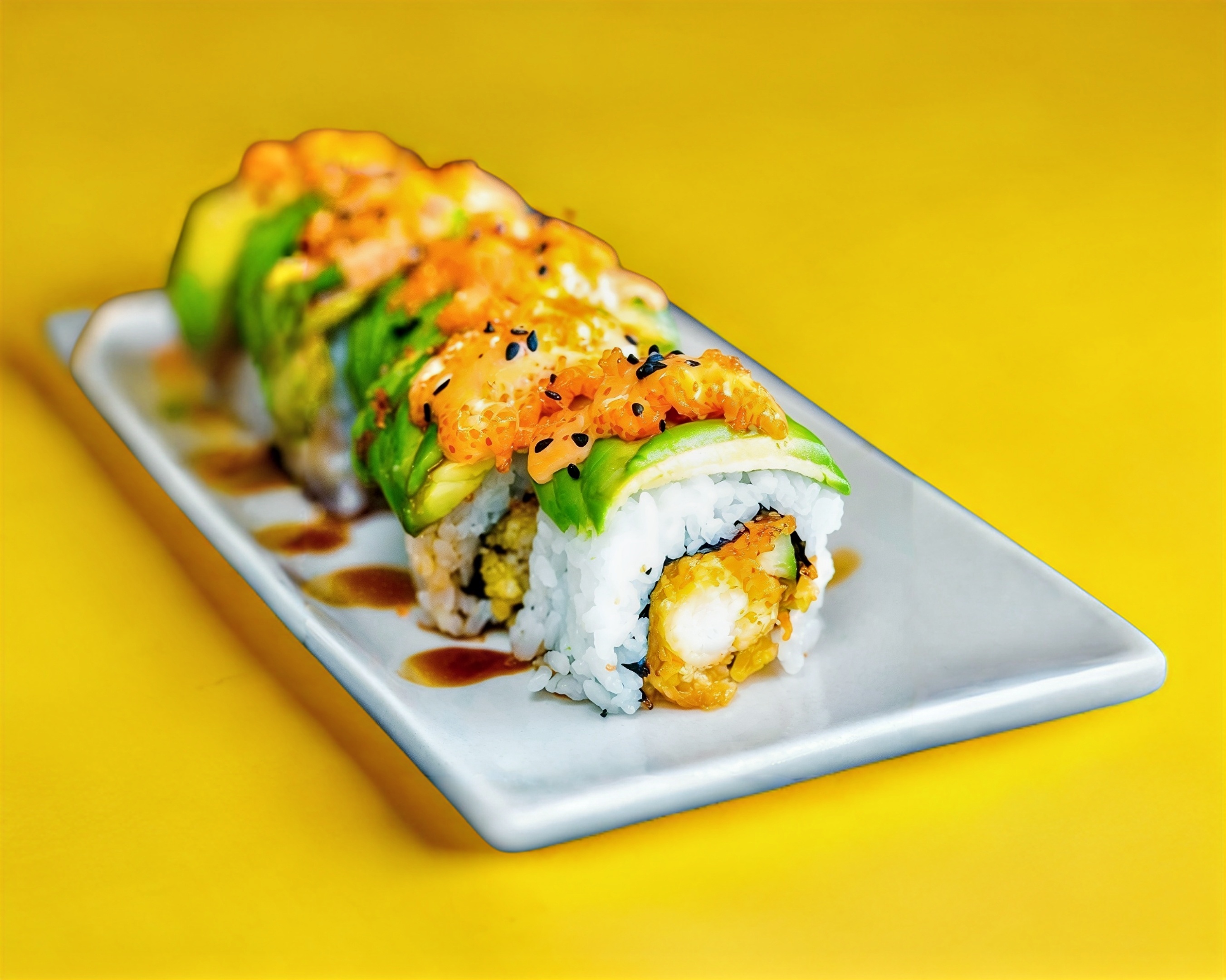Rollo frio de arroz relleno de queso crema, aguacate, pepino y tampico.