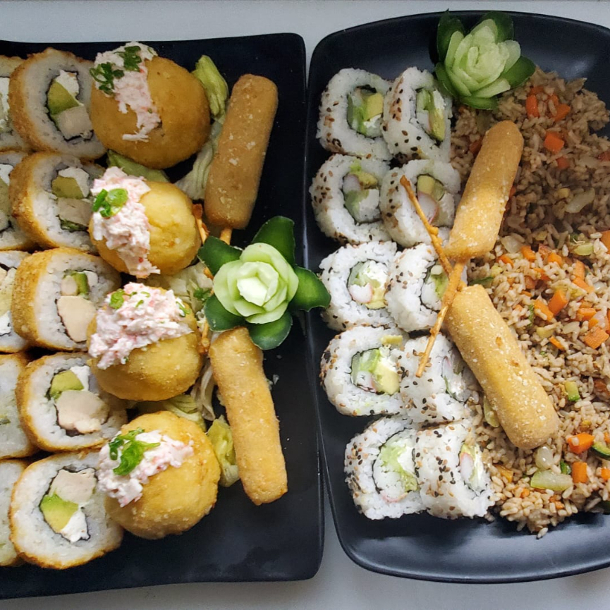 2 Rollos frios o empanizados a elegir entre pollo, cangrejo, res, tampico o vegetariano. Arroz gohan con tampico 2 porciones.