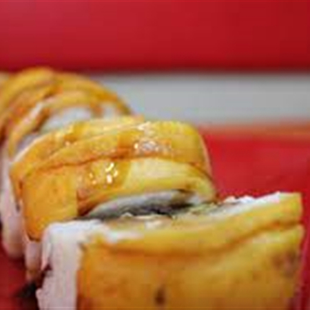 Rollo con cubierta de mango relleno de de aguacate queso crema y camarón empanizado.