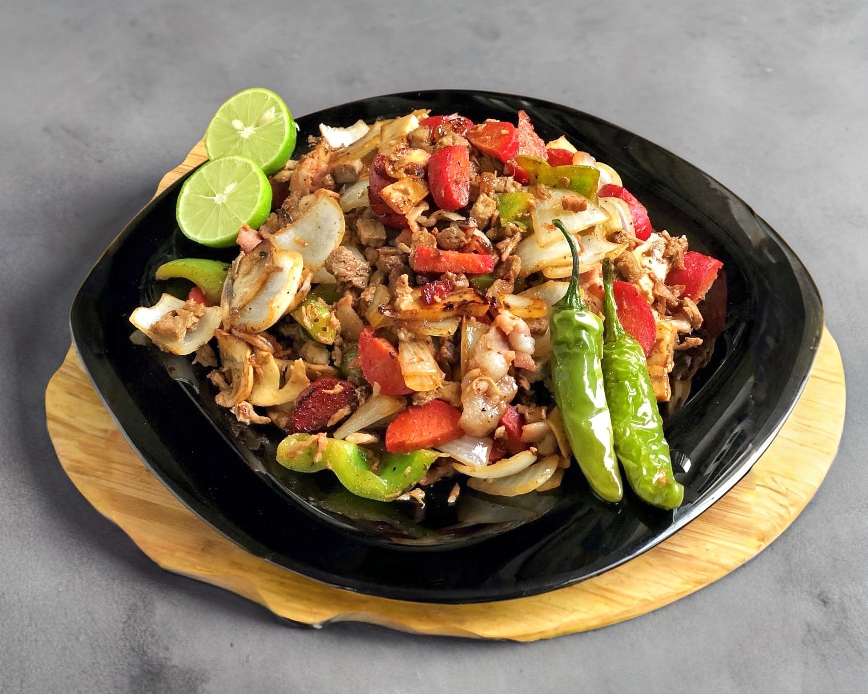 Mezcla de carne asada en cuadros y vegetales (champiñones, salchicha, tocino, pimiento, cebolla) acompañada de limones , salsa y tortillas.