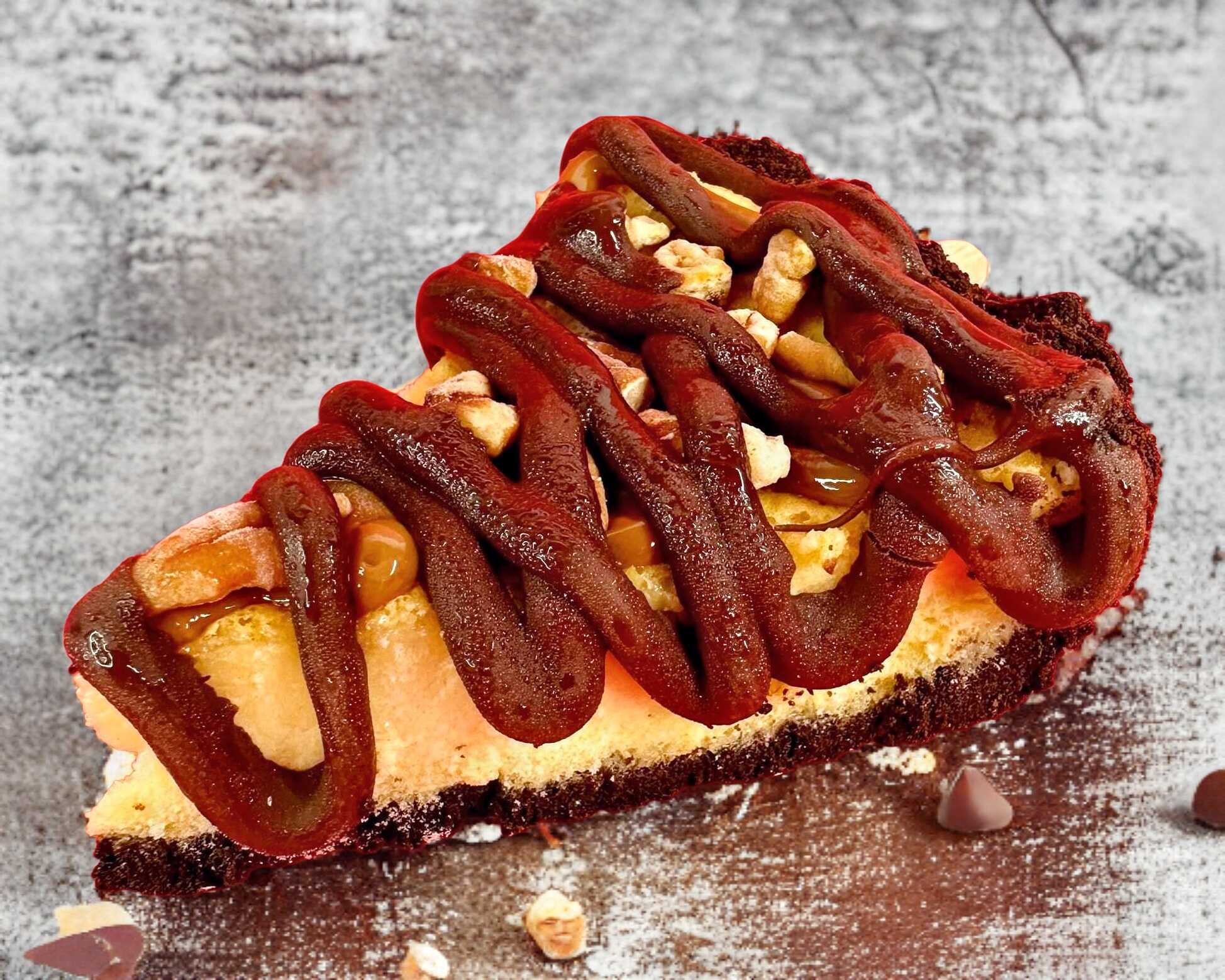Rebanada de cheesecake tortuga, con base de galleta Oreo, bañada con cajeta, chocolate y nuez.