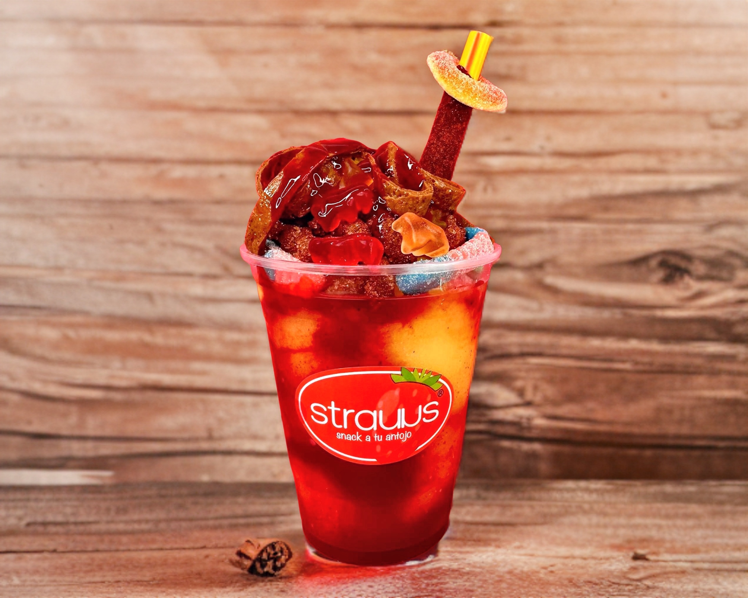 Chica 16 oz, mezcla de smooyhie de fruta 100% natural, incluye chamoy, panditas, lombrices de gomita, golos, serpentina de tamarindo, aro de durazno y lancita de tamarindo.