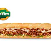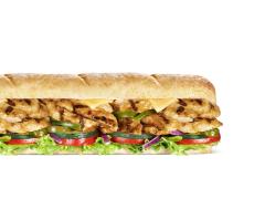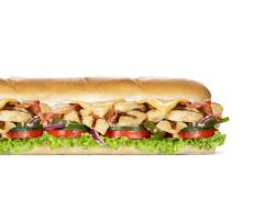 Pan integral con tiras de pechuga de pollo estilo teriyaki, doble porción de queso americano, cebollitas crujientes, lechuga, jitomates, pimientos verdes y aderezo de cebolla dulce.