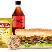 Pan integral con tiras de pechuga de pollo estilo teriyaki, doble porción de queso americano, cebollitas crujientes, lechuga, jitomates, pimientos verdes y aderezo de cebolla dulce, más papas, galleta y bebida.