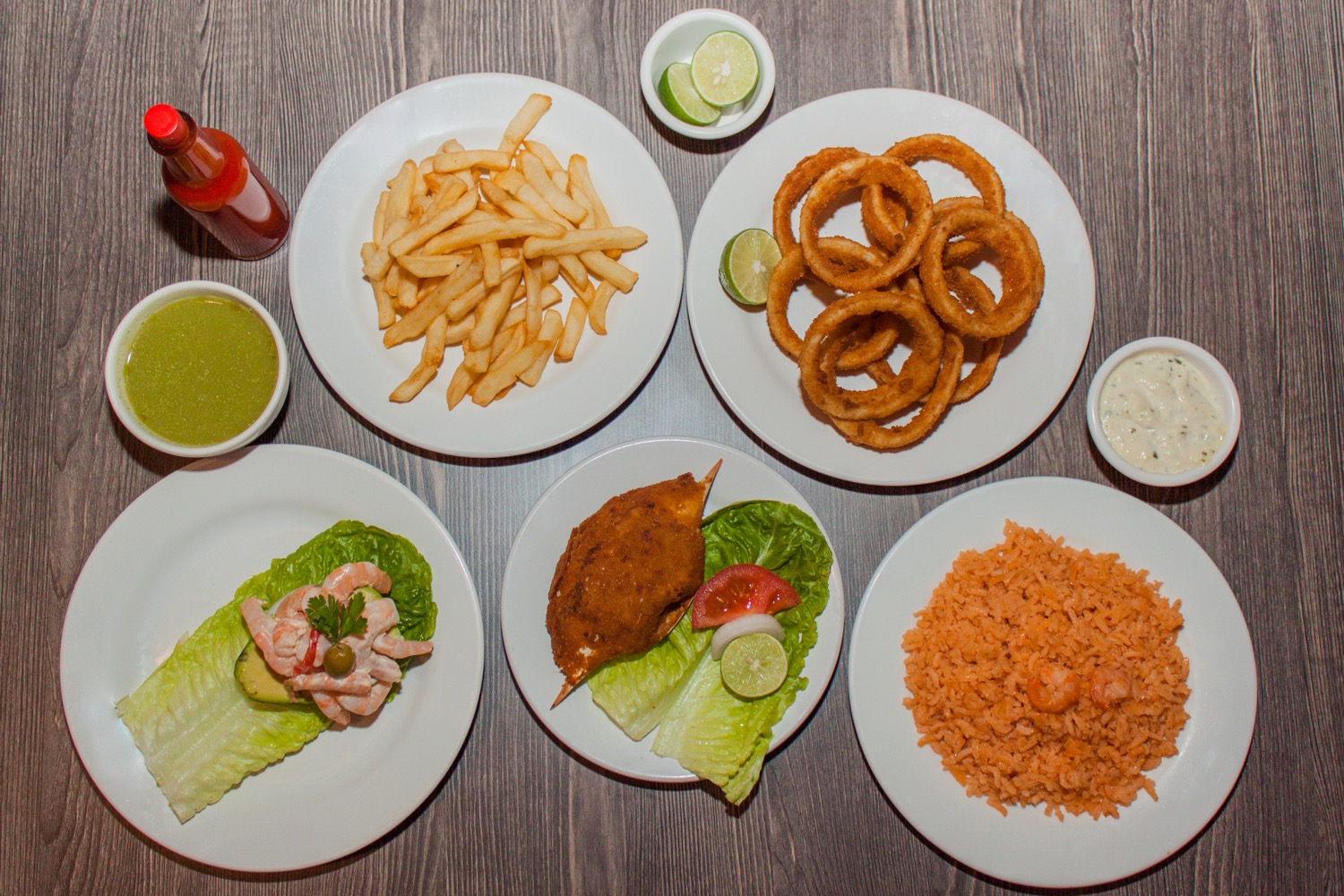 6 Camarones empanizados con dos guarniciones.