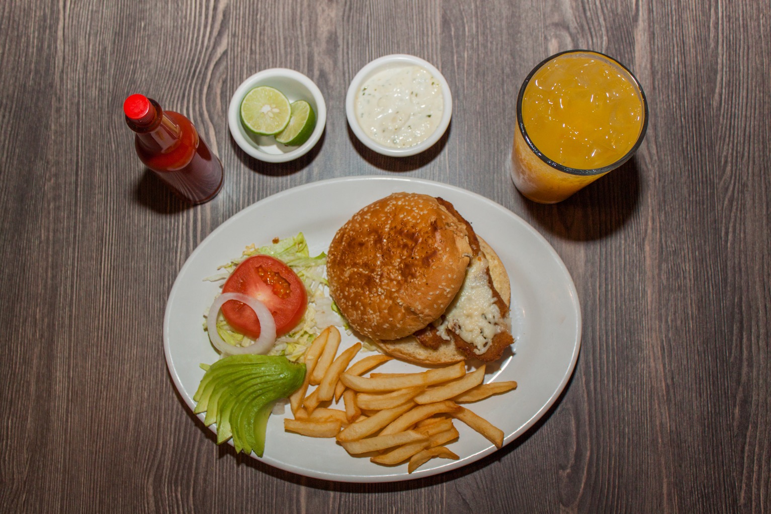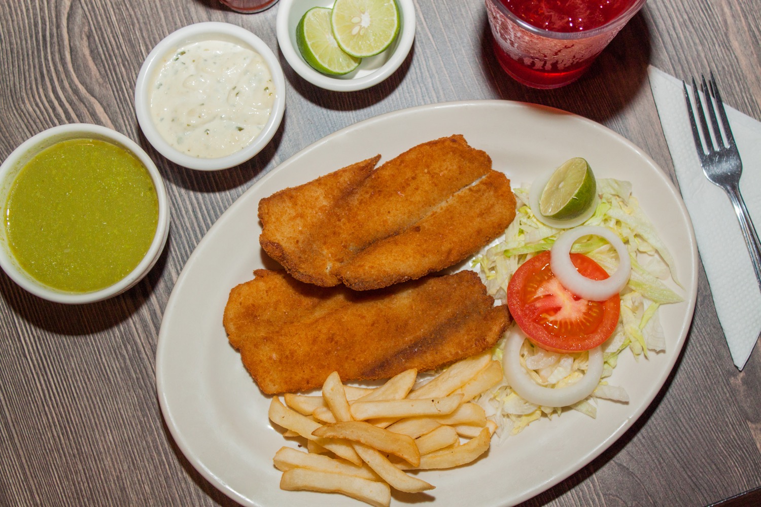 180 Gr. de filete de pescado al gusto. Puede ser: empanizado, a la parrilla, al maíz o al mojo de ajo.