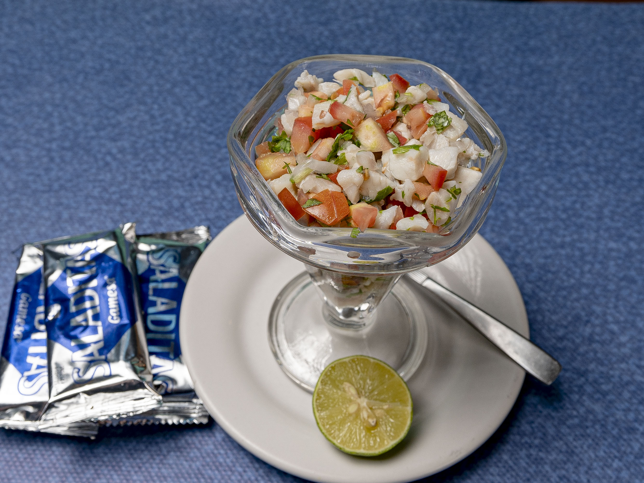Ceviche de 90 gr de pescado marinado en limón y pico de gallo.