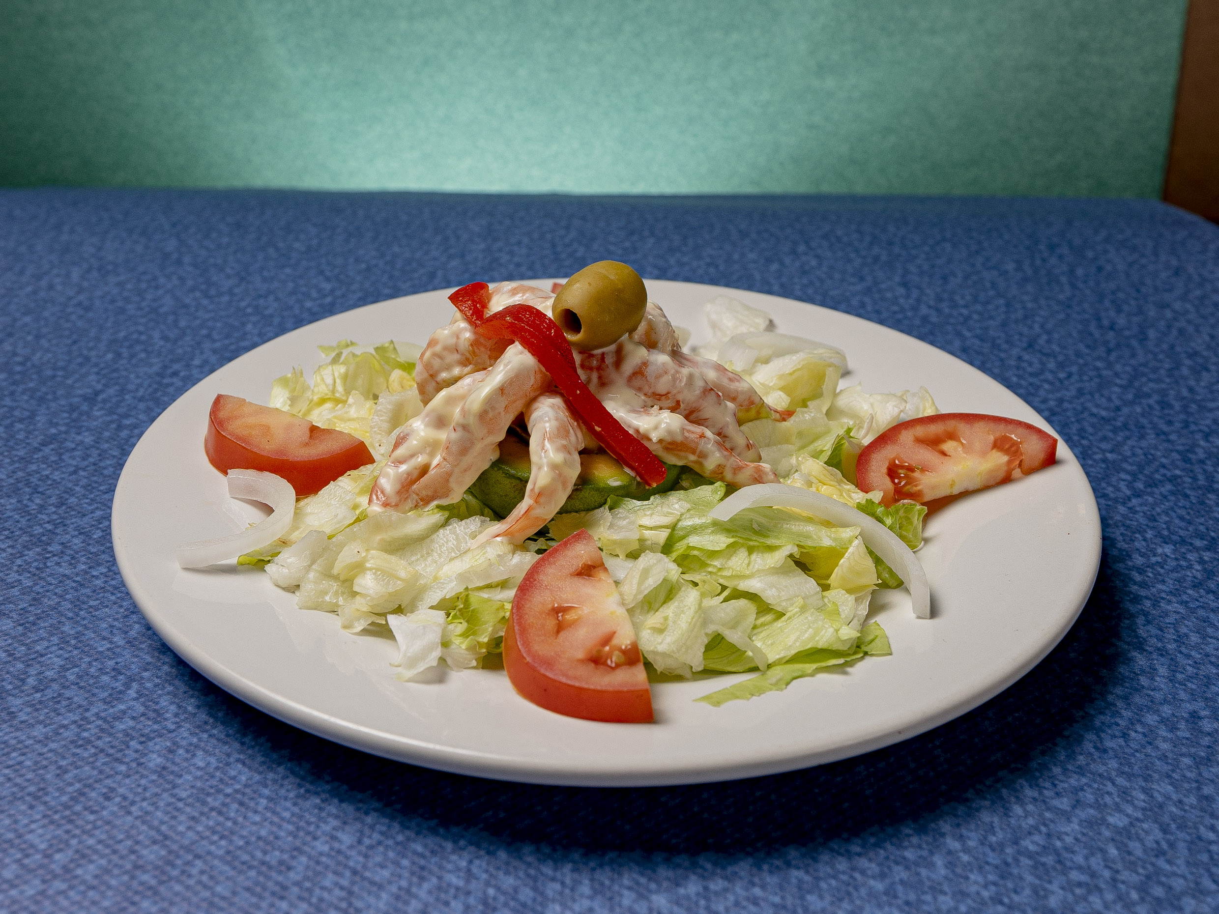 Medio aguacate relleno con camarones y mayonesa.