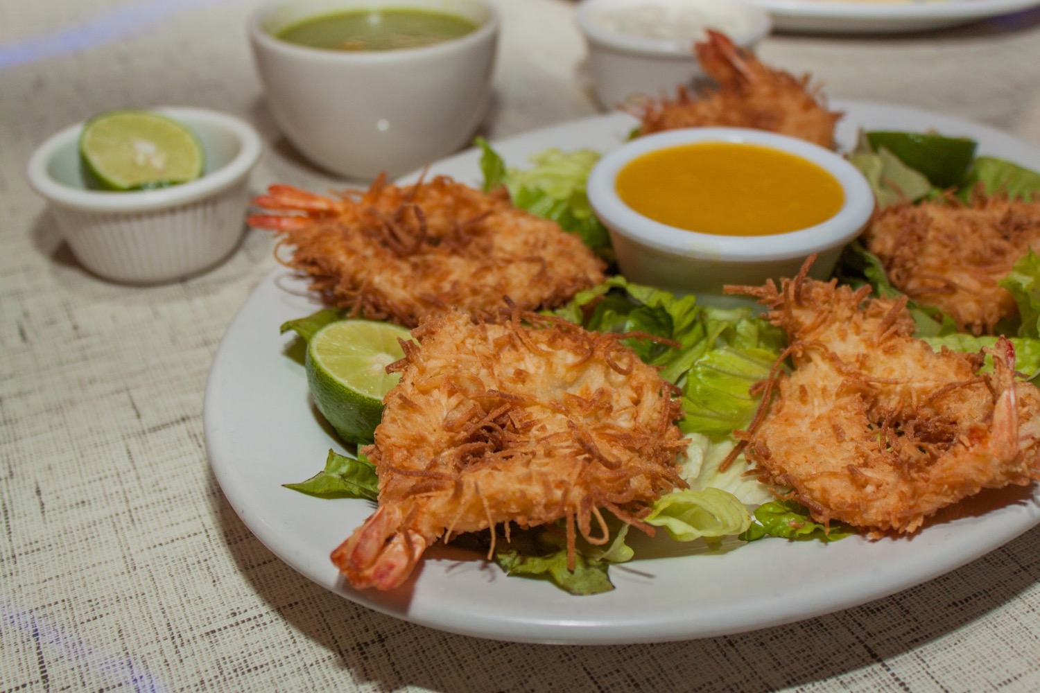 5 Camarones fritos en coco rayado con salsa de mango.