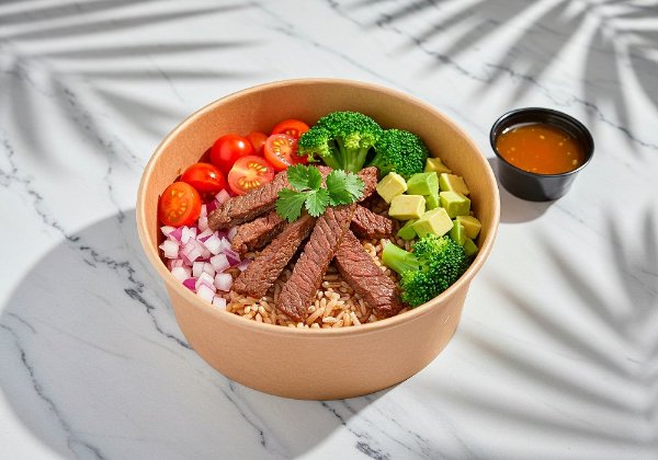 Bowl a base de arroz integral con arrachera, brócoli, tomate cherry, cebolla morada, aguacate, cilantro y vinagreta a elección. El tamaño perfecto para que lo acompañes con una sopa o wrap.