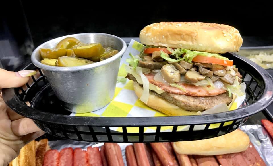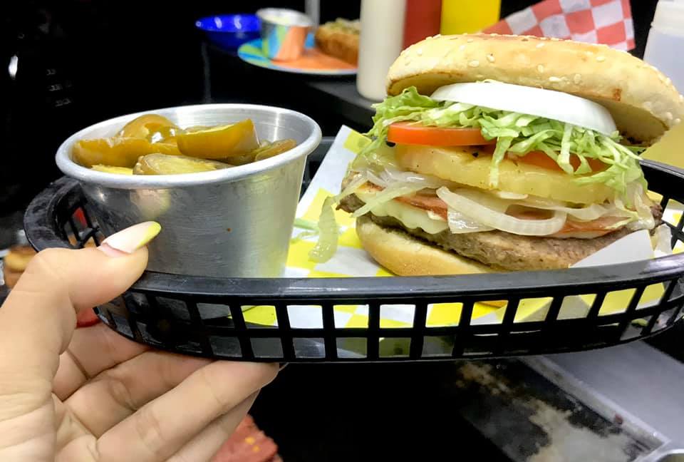 Hamburguesa de Arrachera con Tocino, jamon, queso chihuahua, Cebolla morada, lechuga, tomate y cebolla dorada. (incluye Papas a la Francesa)