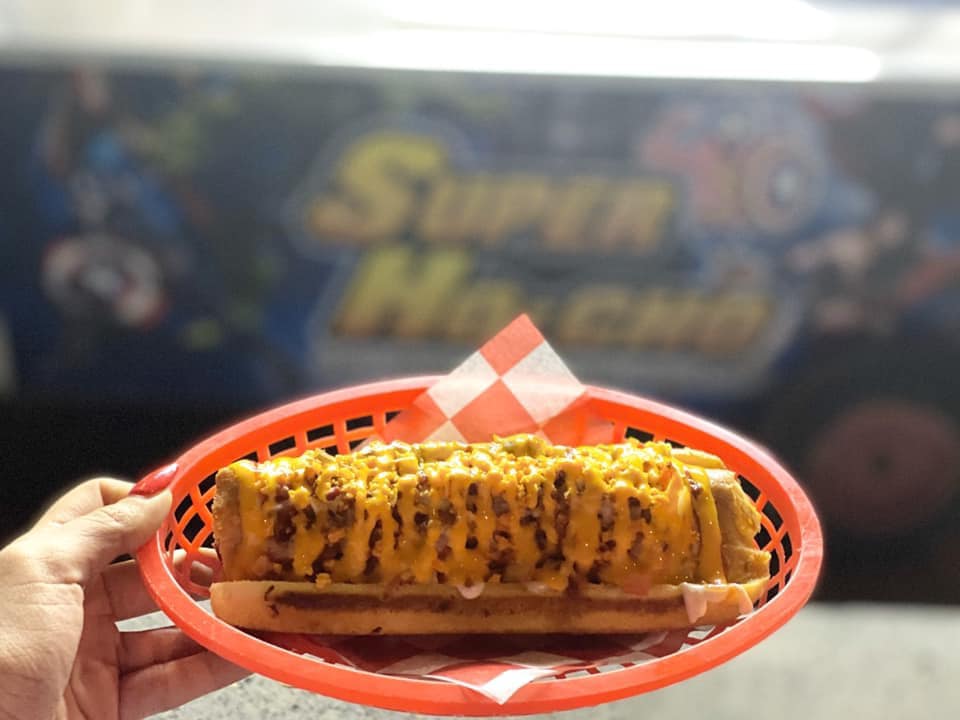 Hotdog de Salchicha de Pavo Jumbo en pan de 20 cm. con ajonjoli, acompañado de mayonesa, mostaza, catsup, tomate, cebolla, jalapeño y cebolla frita.