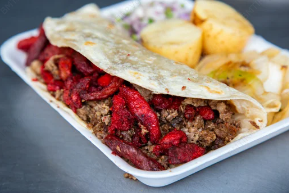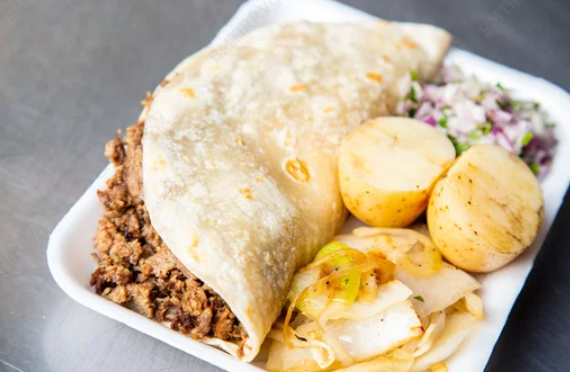 Tortilla de harina, queso asadero y carne.