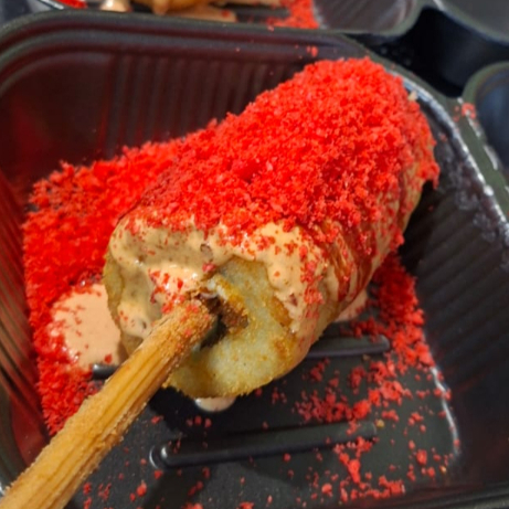 Medio rollo empanizado relleno de camarón, aguacate, queso crema y alga. Cubierto con salsa chipotle, sirracha y chetoos Flamin'Hot