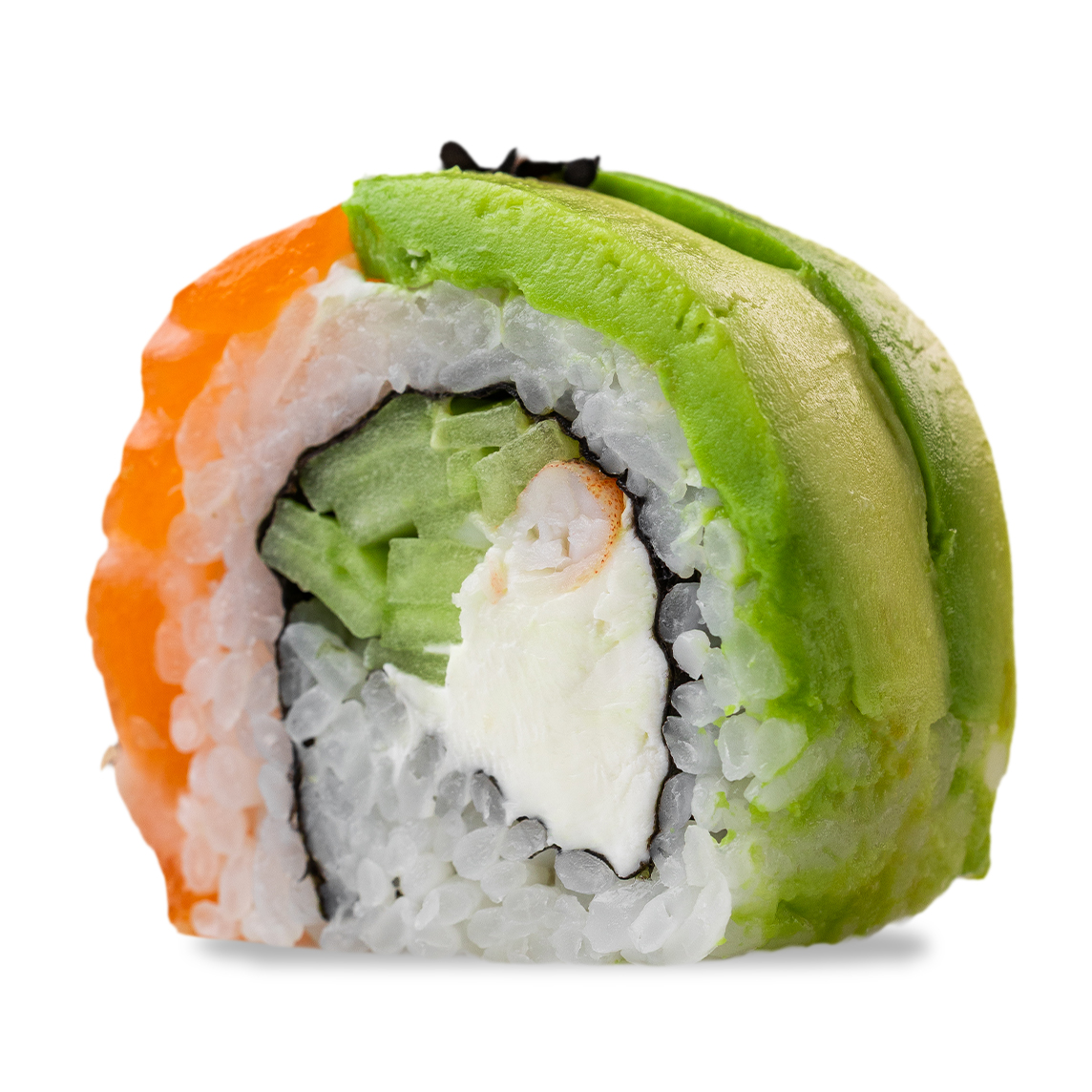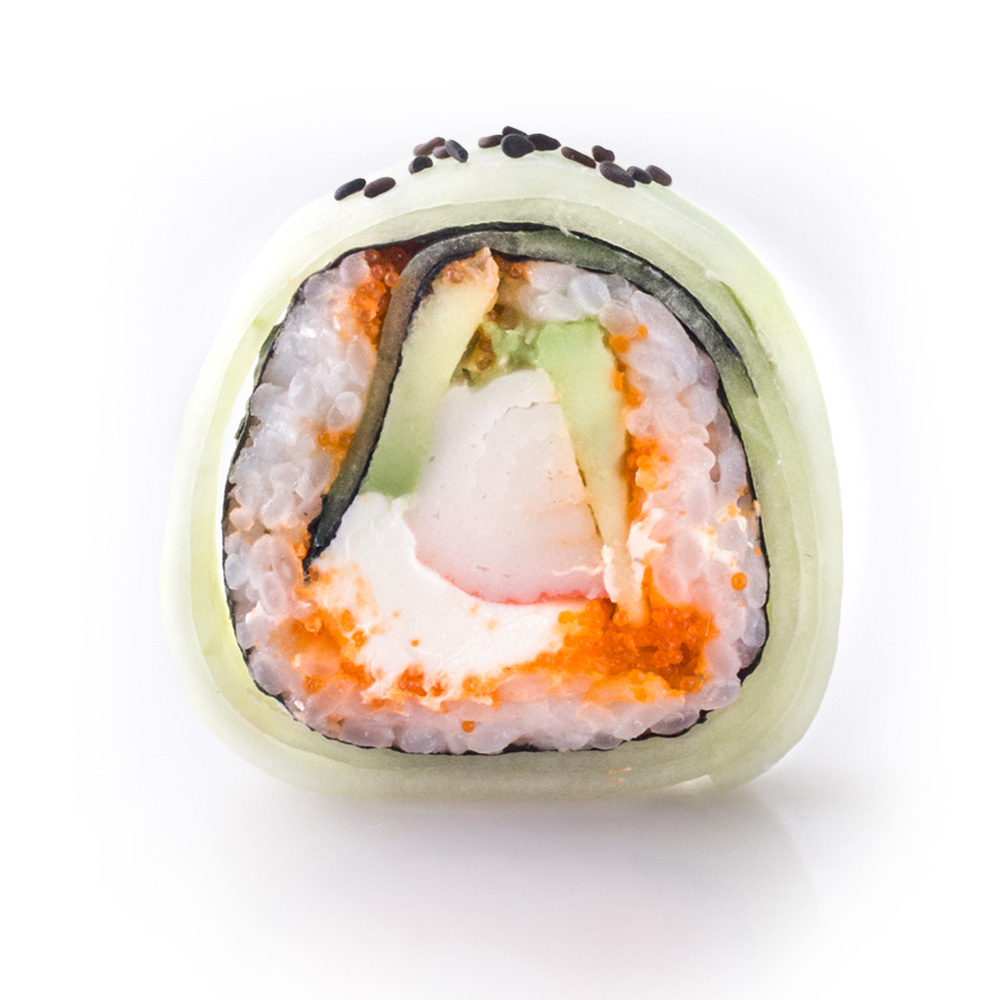 Pepino por fuera, aguacate, philadelphia, mazago y cangrejo.