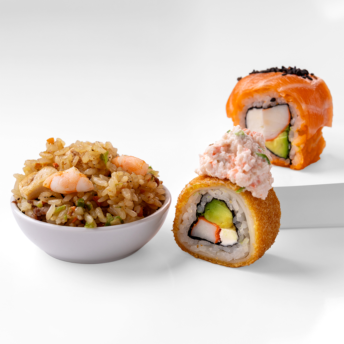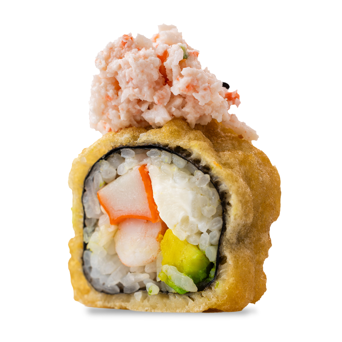 Camarón, philadelphia, aguacate y cangrejo por fuera.