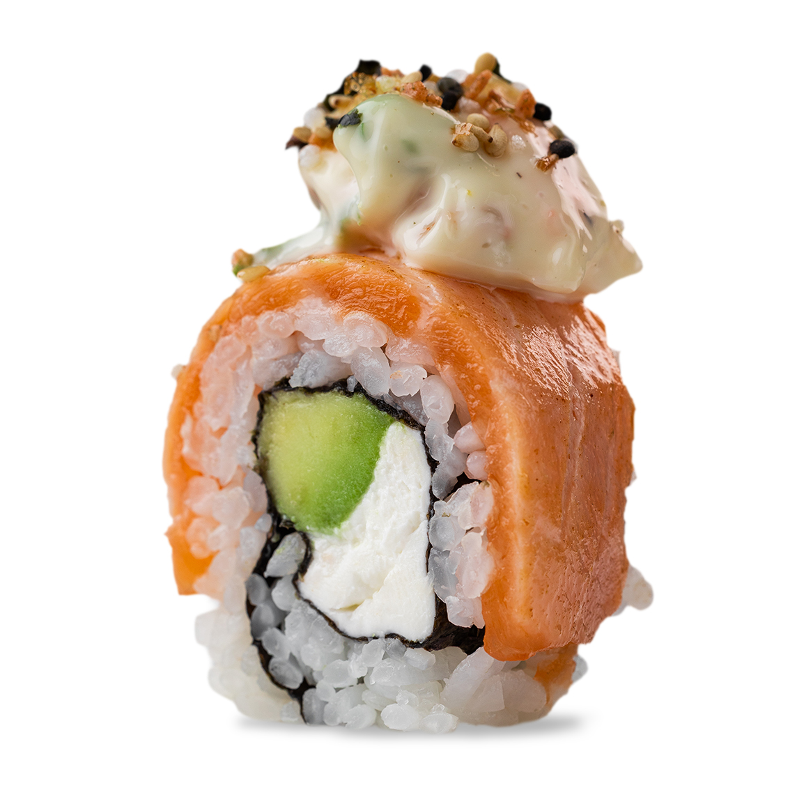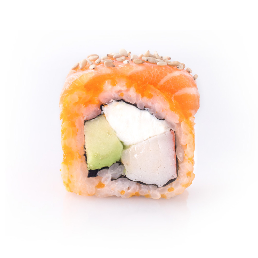 Cangrejo, philadelphia, aguacate, mazago y salmón por fuera.