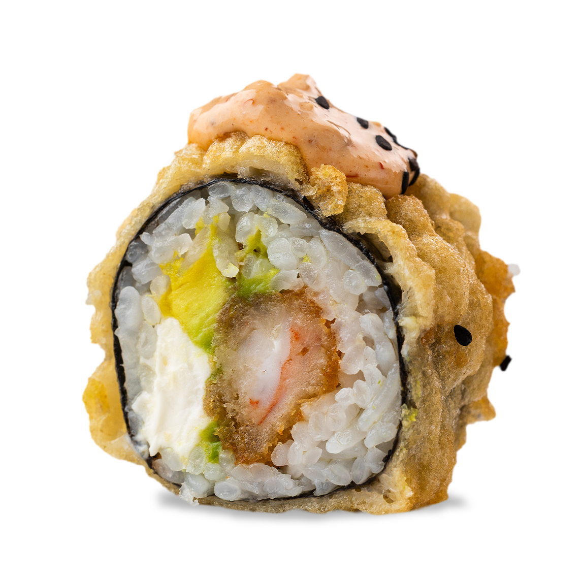 Roll de arroz frito, camarón empanizado, chile serrano, philadelphia y aguacate.
