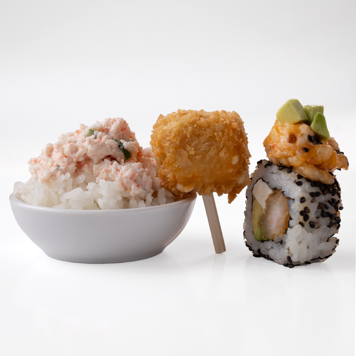 Camarón, queso crema, aguacate, bañados con camarón cruncch y cuadritos de aguacate por fuera