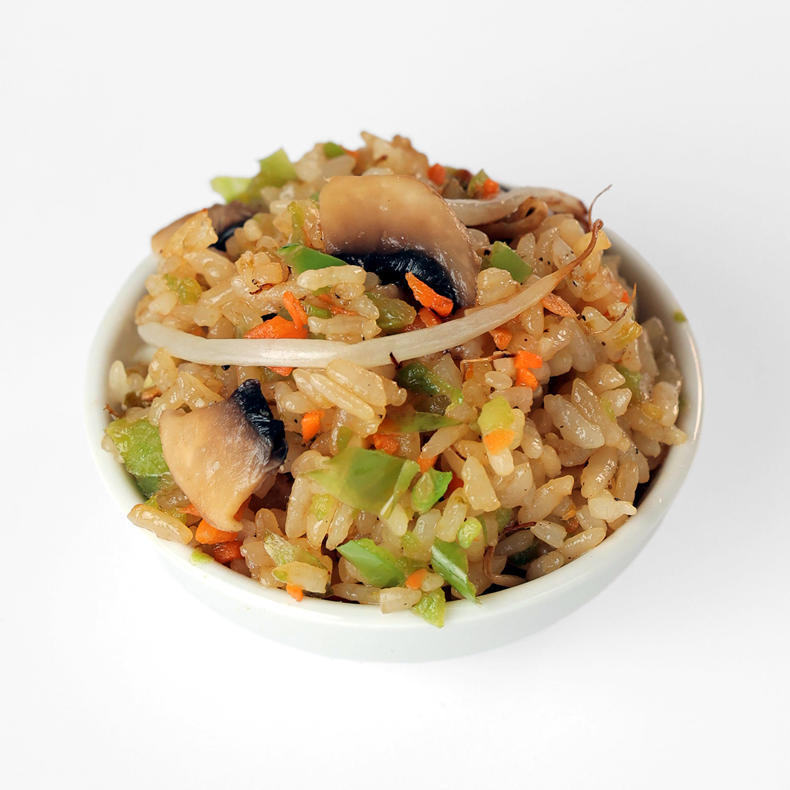 Arroz frito a la plancha con ingrediente a elegir, acompañado de verduras, champiñon y germinado de soya con ajo picado