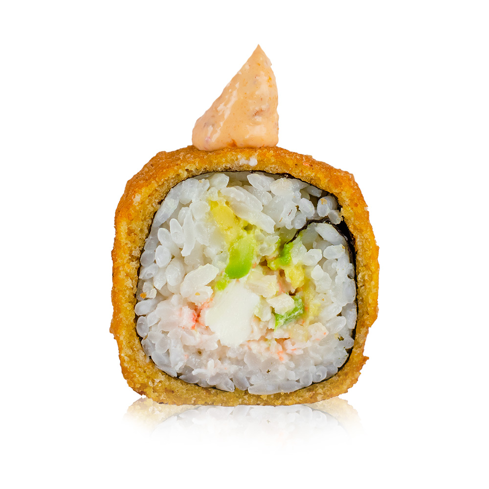 Sushi de camarón empanizado, aguacate, philadelphia, acompañado de aderezo chipotle.