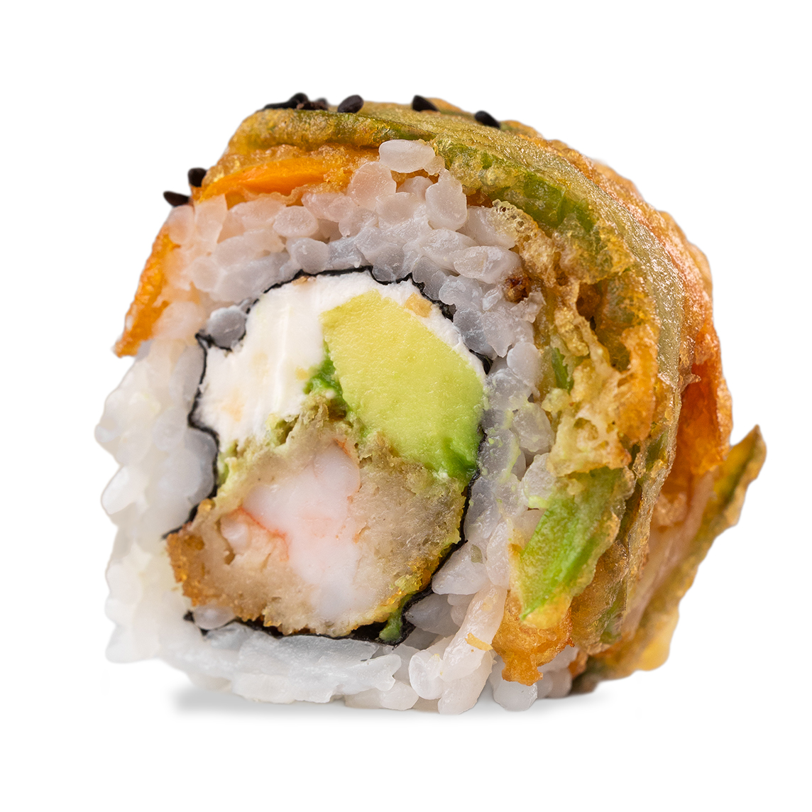 Por fuera verduras capeadas, por dentro aguacate, philadelphia y camaron empanizado