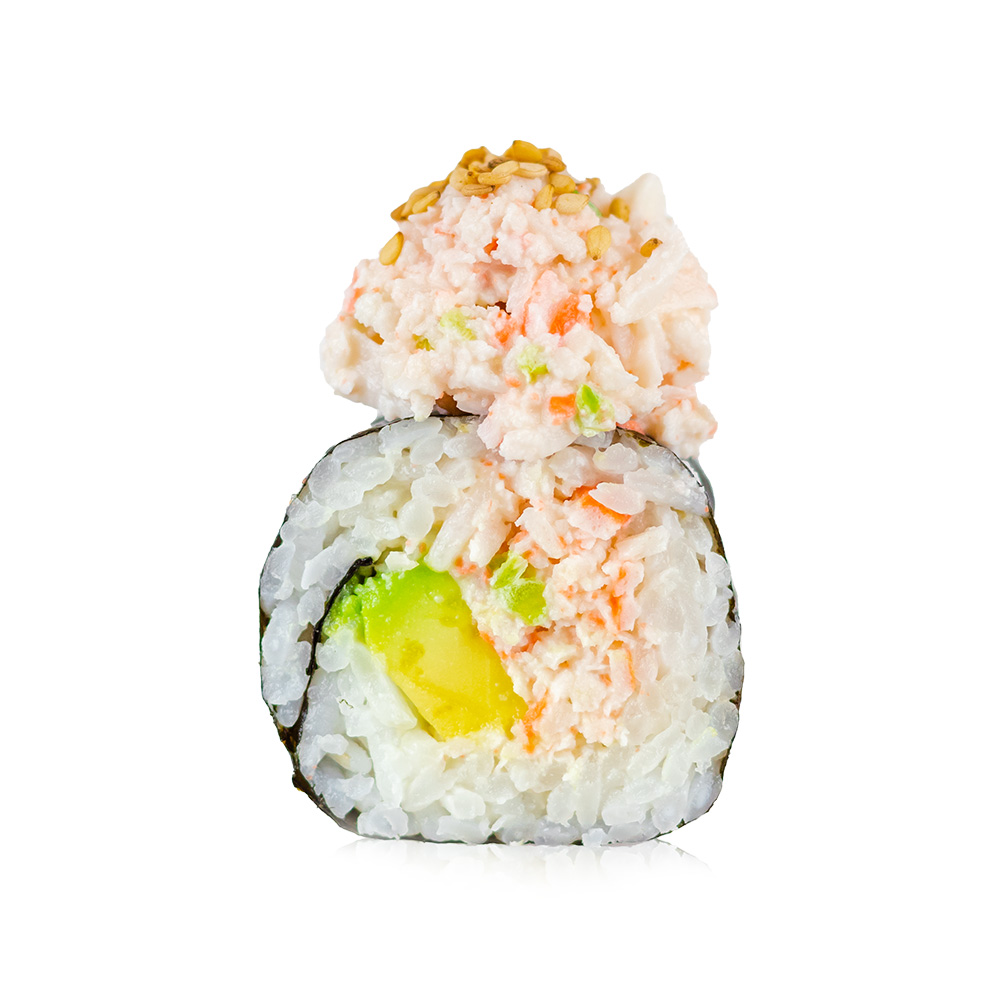 Cangrejo, aguacate y pepino por dentro. Coronado con ensalada mayo spicy