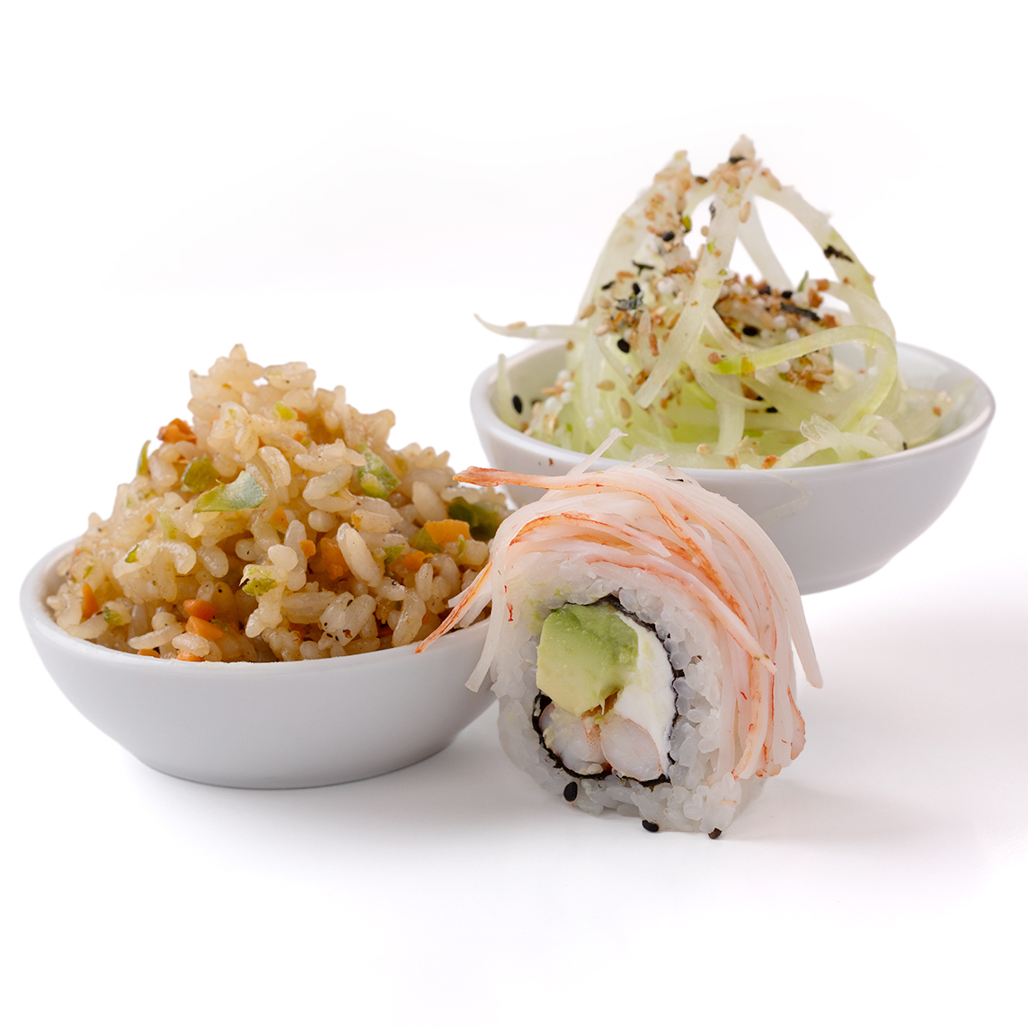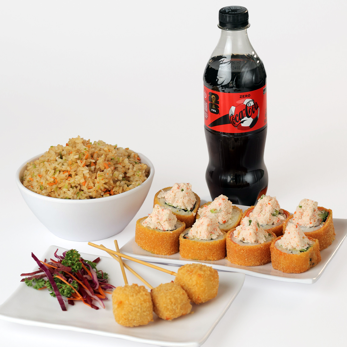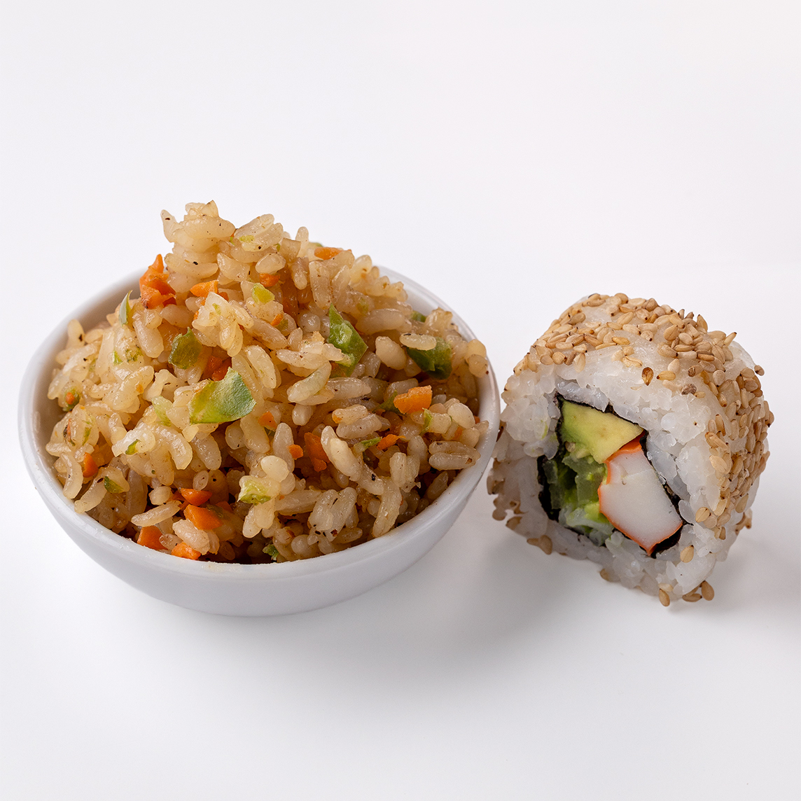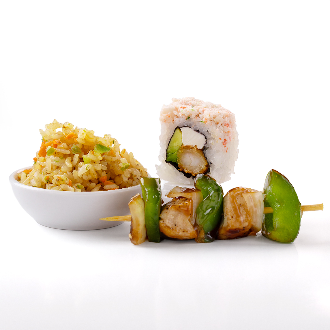 1 yakitori, 1 arroz frito con verduras 1 rollo a tu eleccion