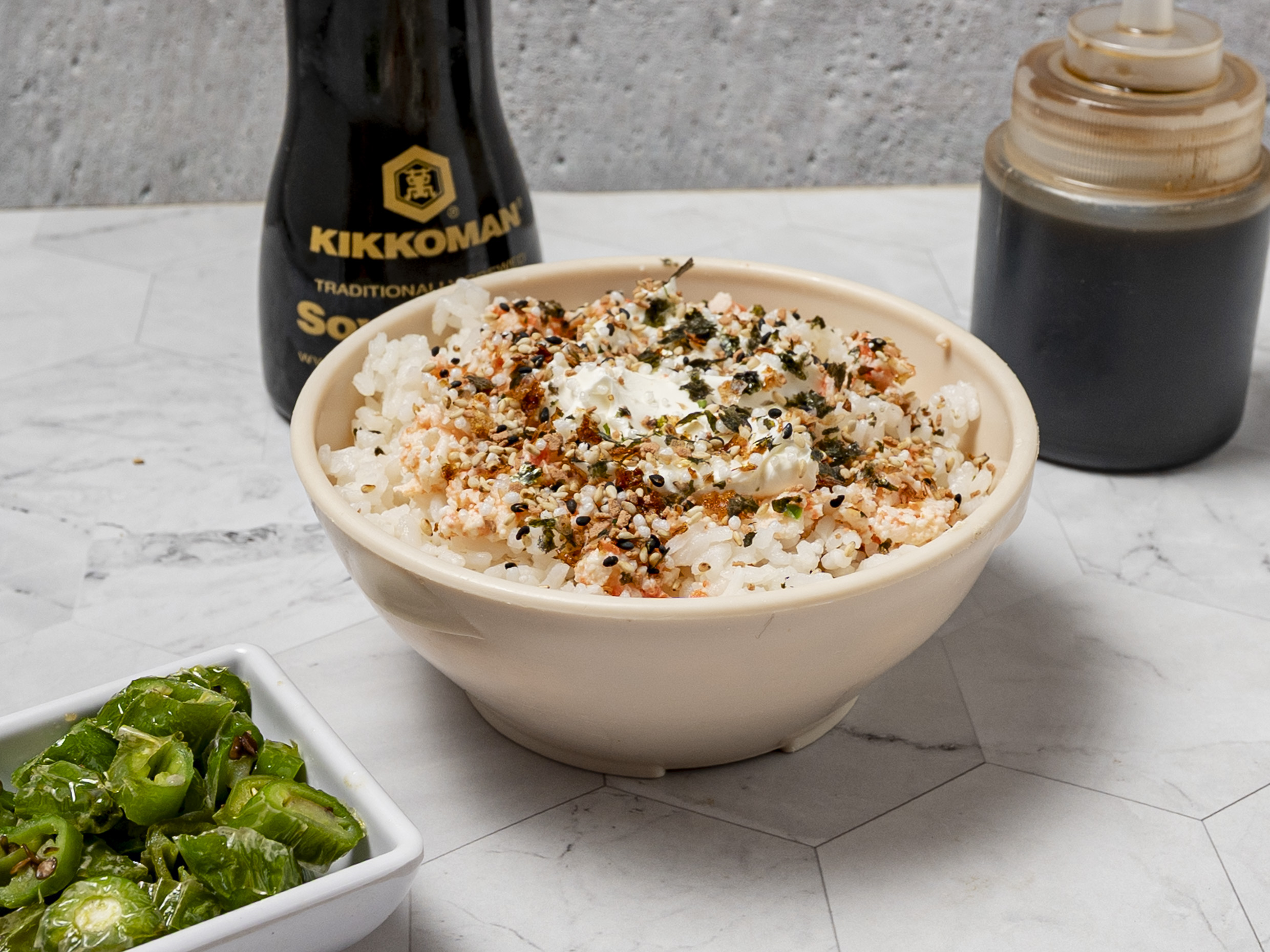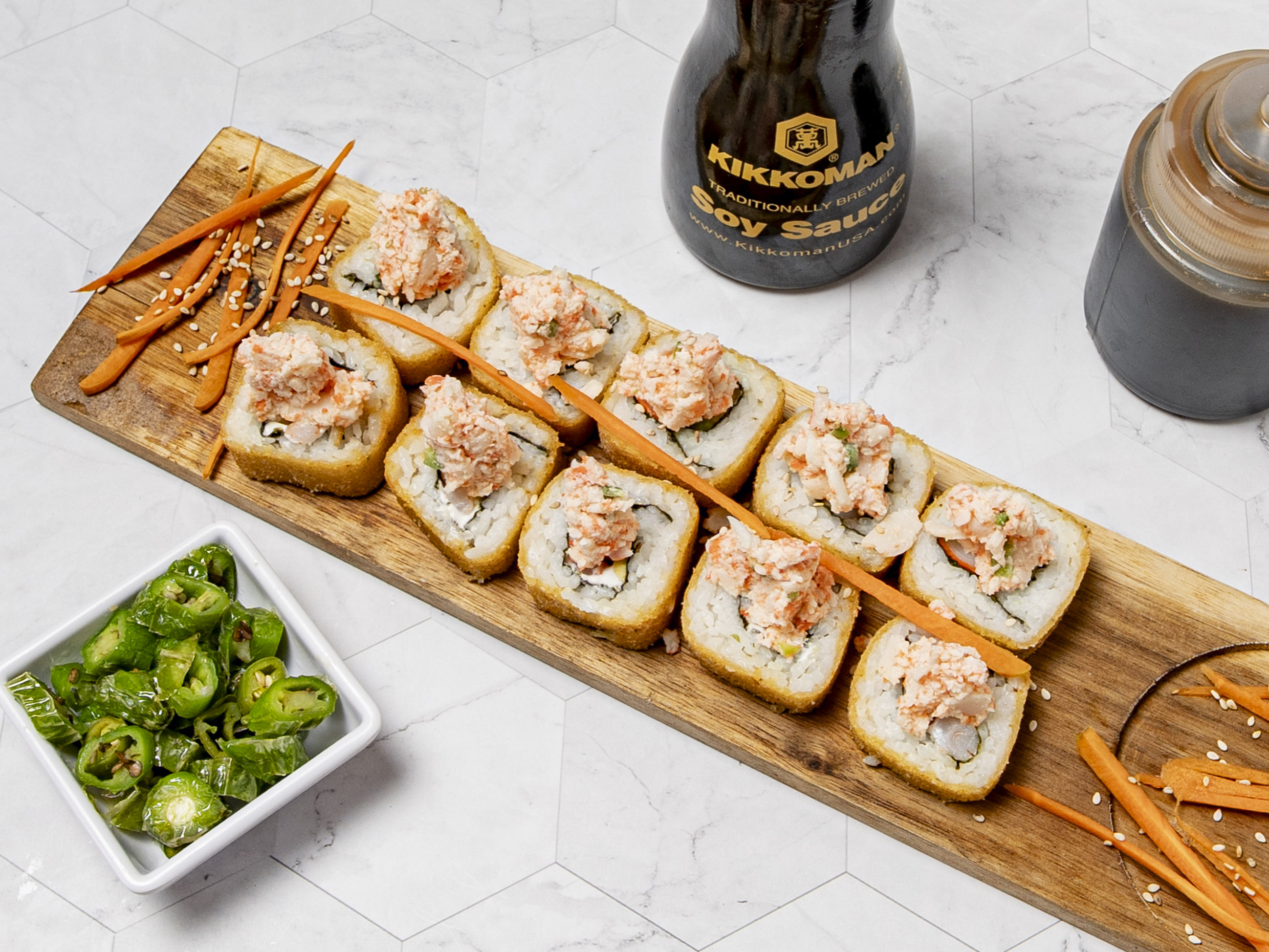 camaron enpanizado queso aguacate y pasta tampico y furikake por fuera