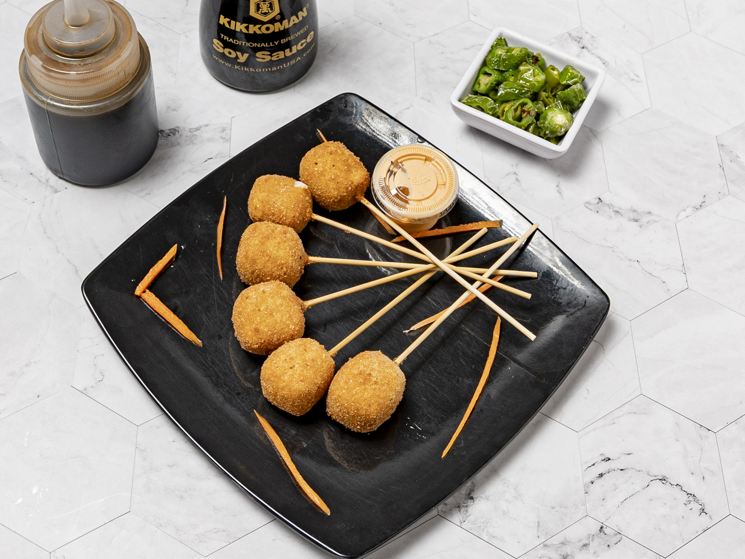 4 banderillas de salmon rellen9s de queso enpanizados y aderezo