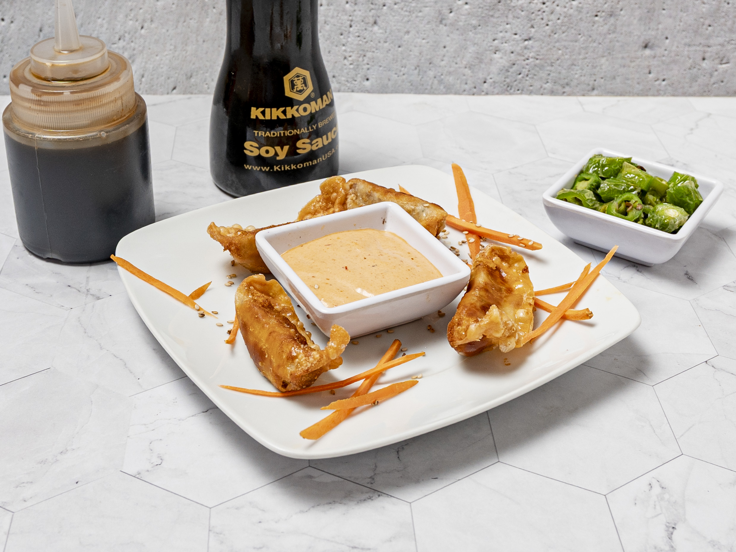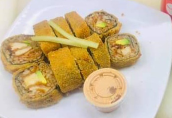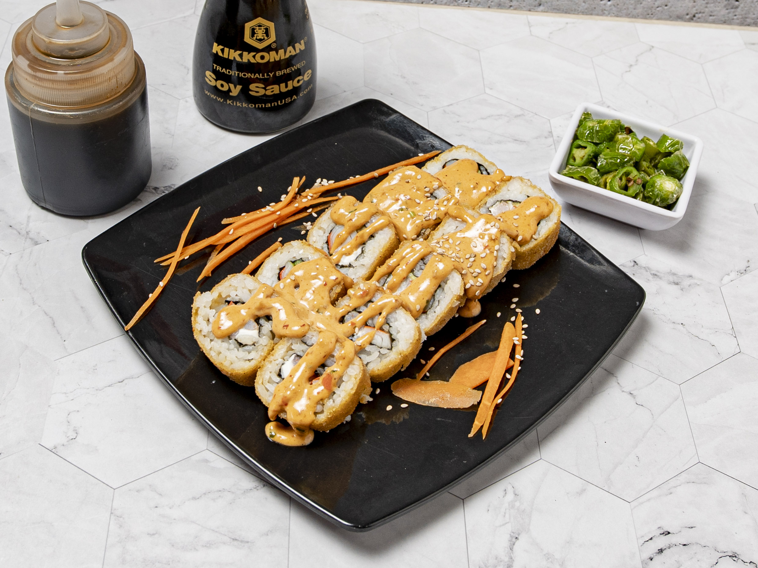 echo con arroz frito chile chipotle cebollin aguacate queso y salmon enpanizado y aderezo