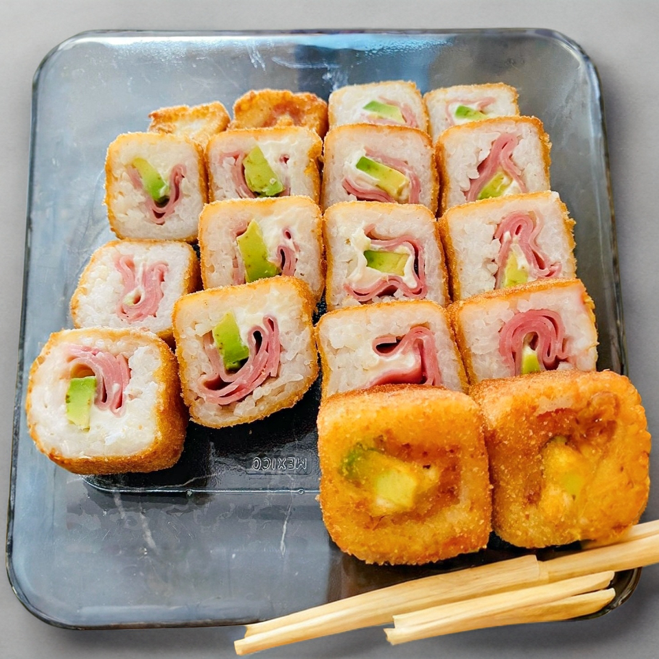 Surimi, queso, aguacate, surimi por fuera, pasta tampico.