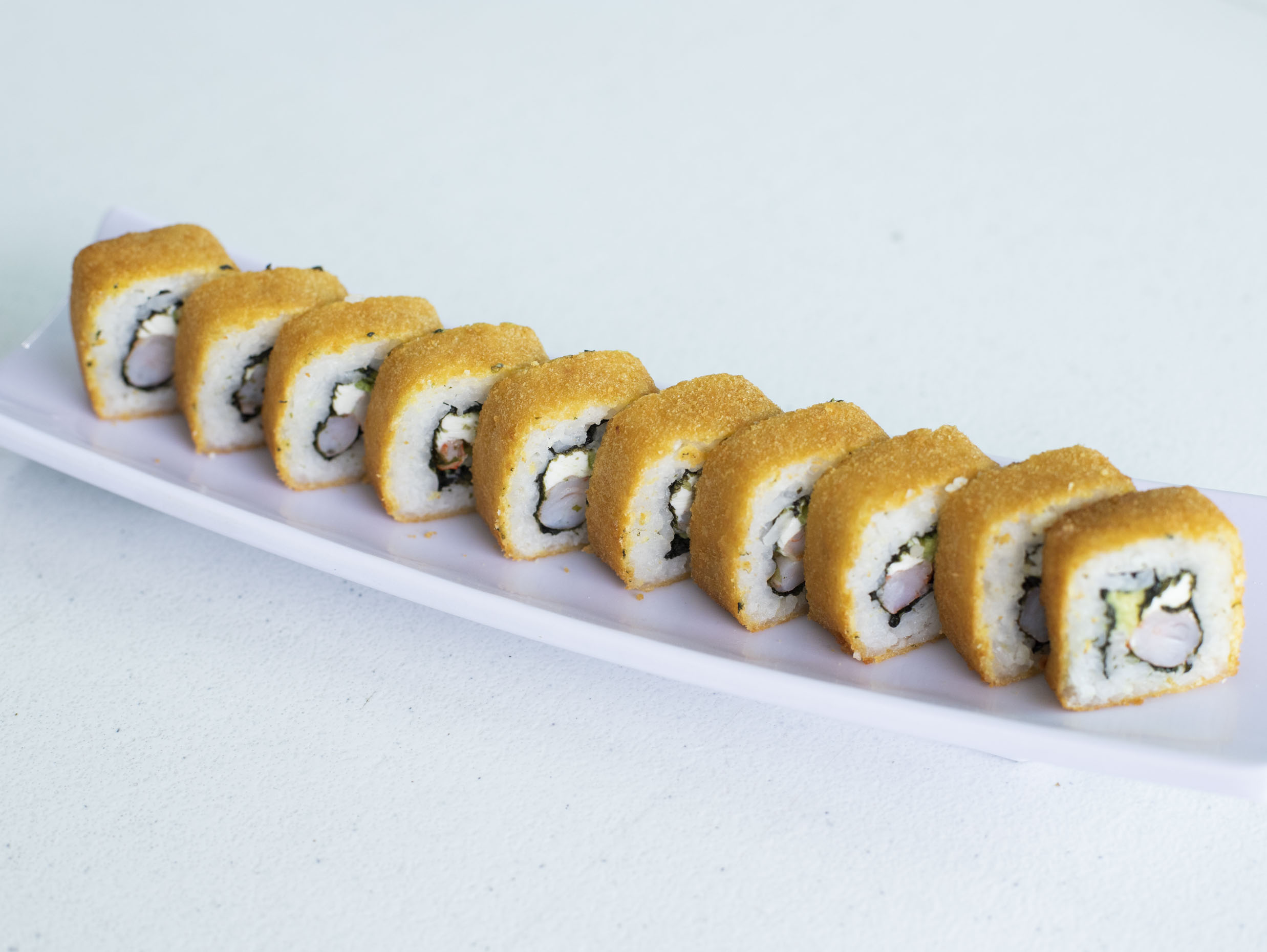 Surimi, camarón, queso crema y aguacate con pasta California por fuera.