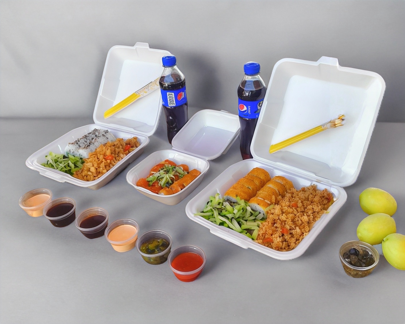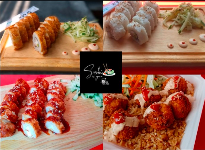 Rollo de Sushi acompañado de arroz y ensalada*2 + Orden de Varitas de Surimi Fritas*1 + Refrescos de 600 ml*2