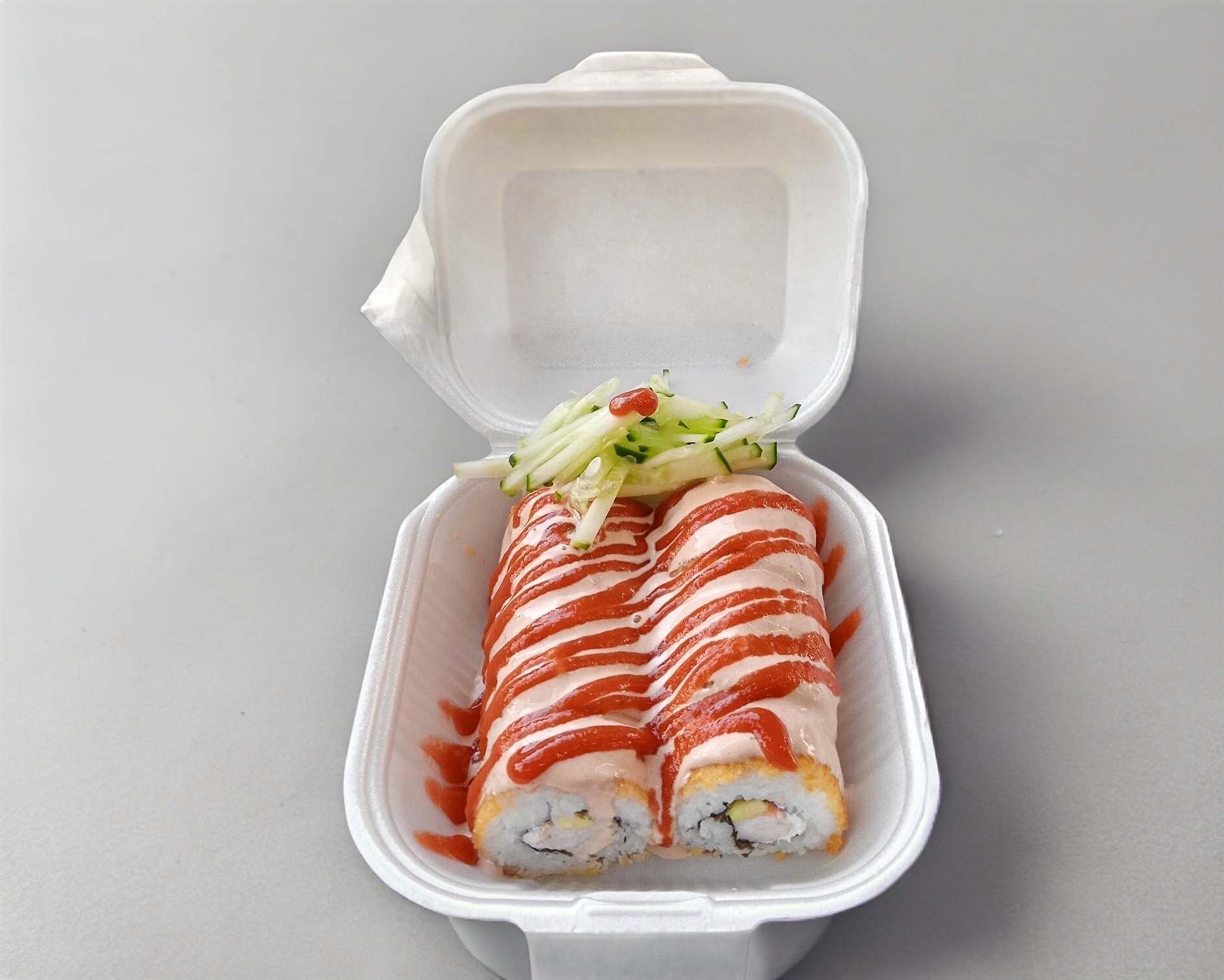 El termino frio se le da por no llevar empanizado, puedes pedirlo del marisco ó carne de tu elección, contamos con camarón, pollo, surimi y salmón, viene acompañado por ensalada de pepino a un lado.