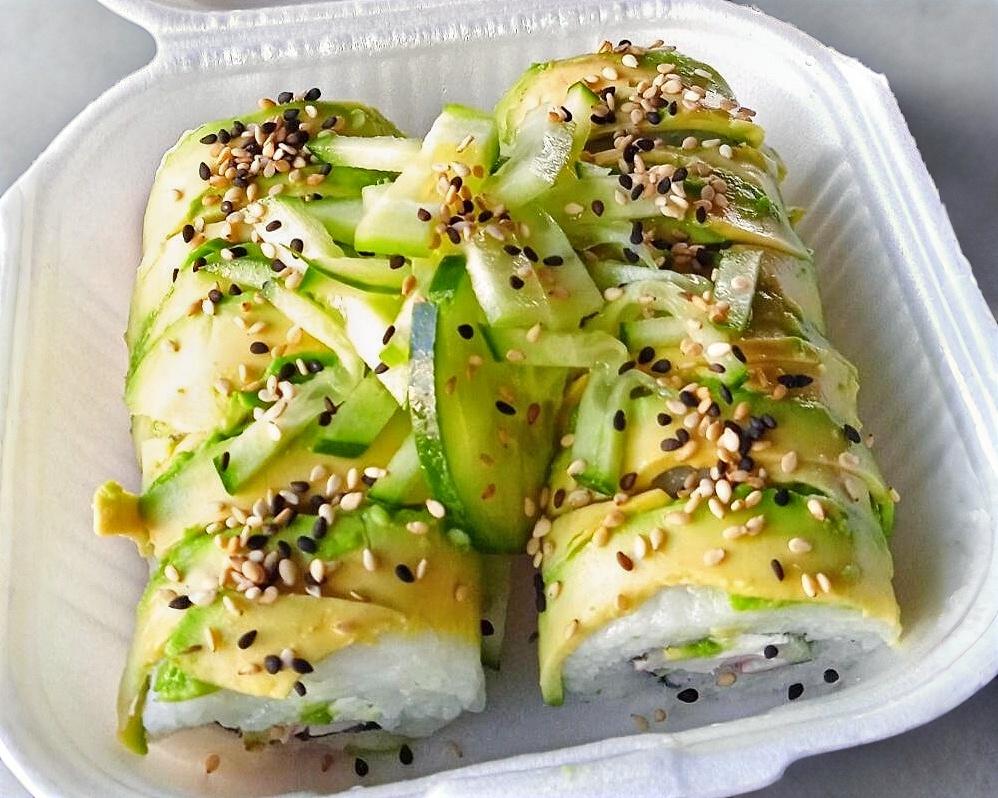 Es un delicioso rollo frío con cubierta de aguacate con ajonjolí al exterior y también tiene relleno de aguacate, tu eliges el marisco ó carne al gusto.