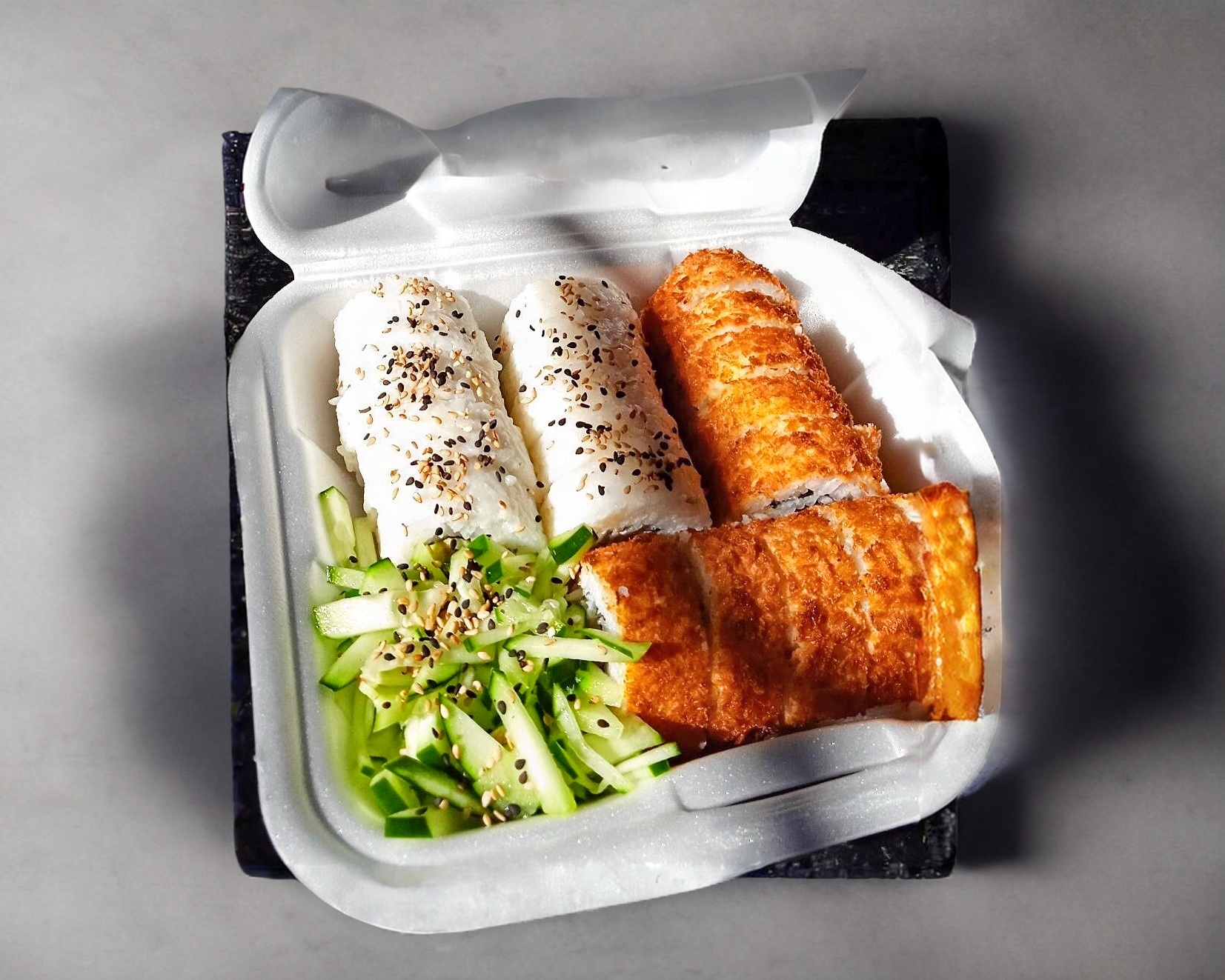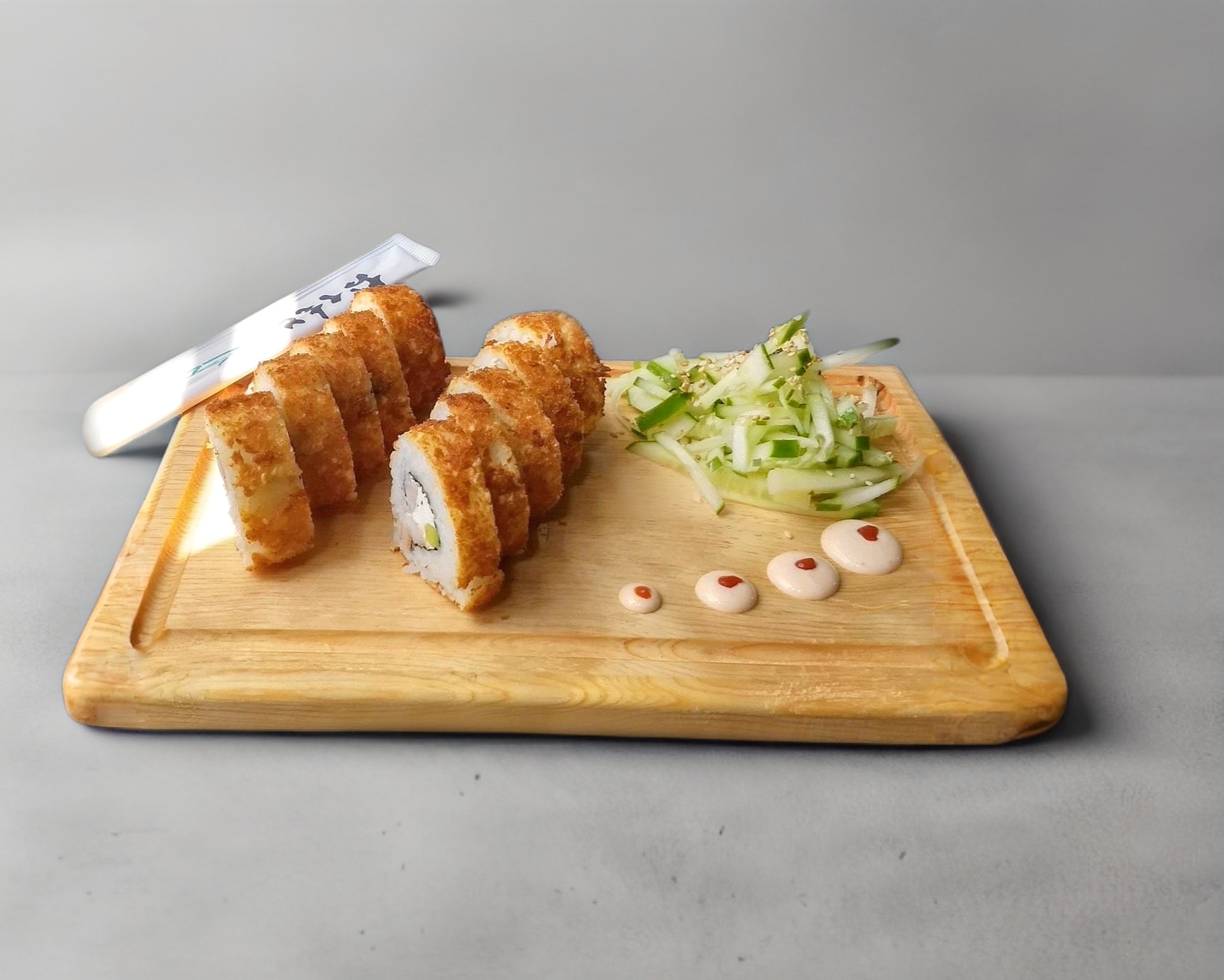 Rollo empanizado con el marisco ó carne de tu elección, contamos con camarón, surimi, salmón y pollo, todos los rollos llevan queso crema y aguacate, acompañados con ensalada de pepino por un lado.