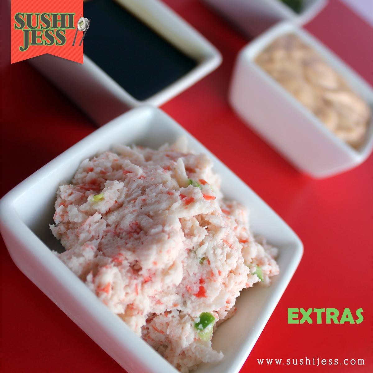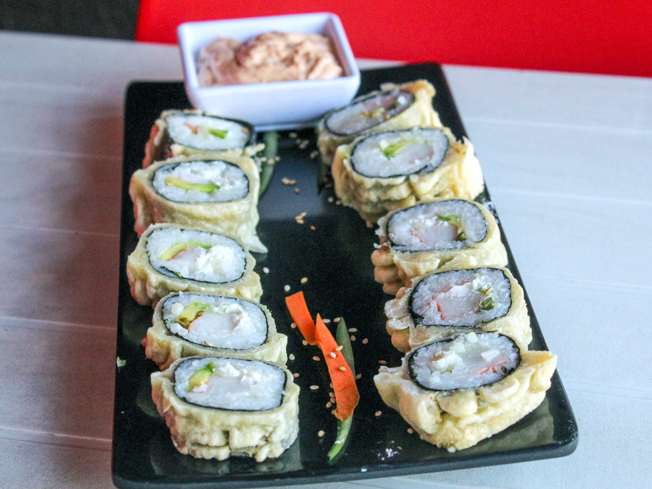 3 Barritas de surimi rellenas de queso philadelphia empanizadas o capeadas.