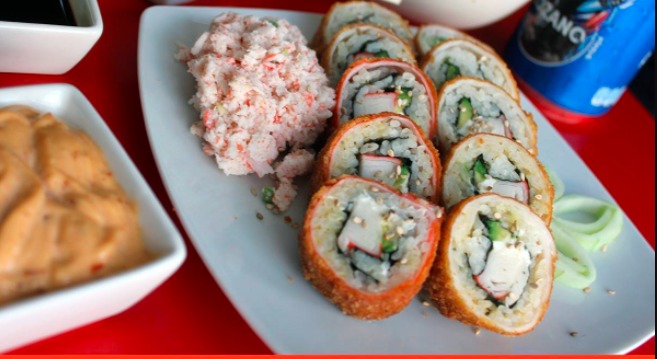 Cangrejo, aguacate, pepino, y mazago por fuera.