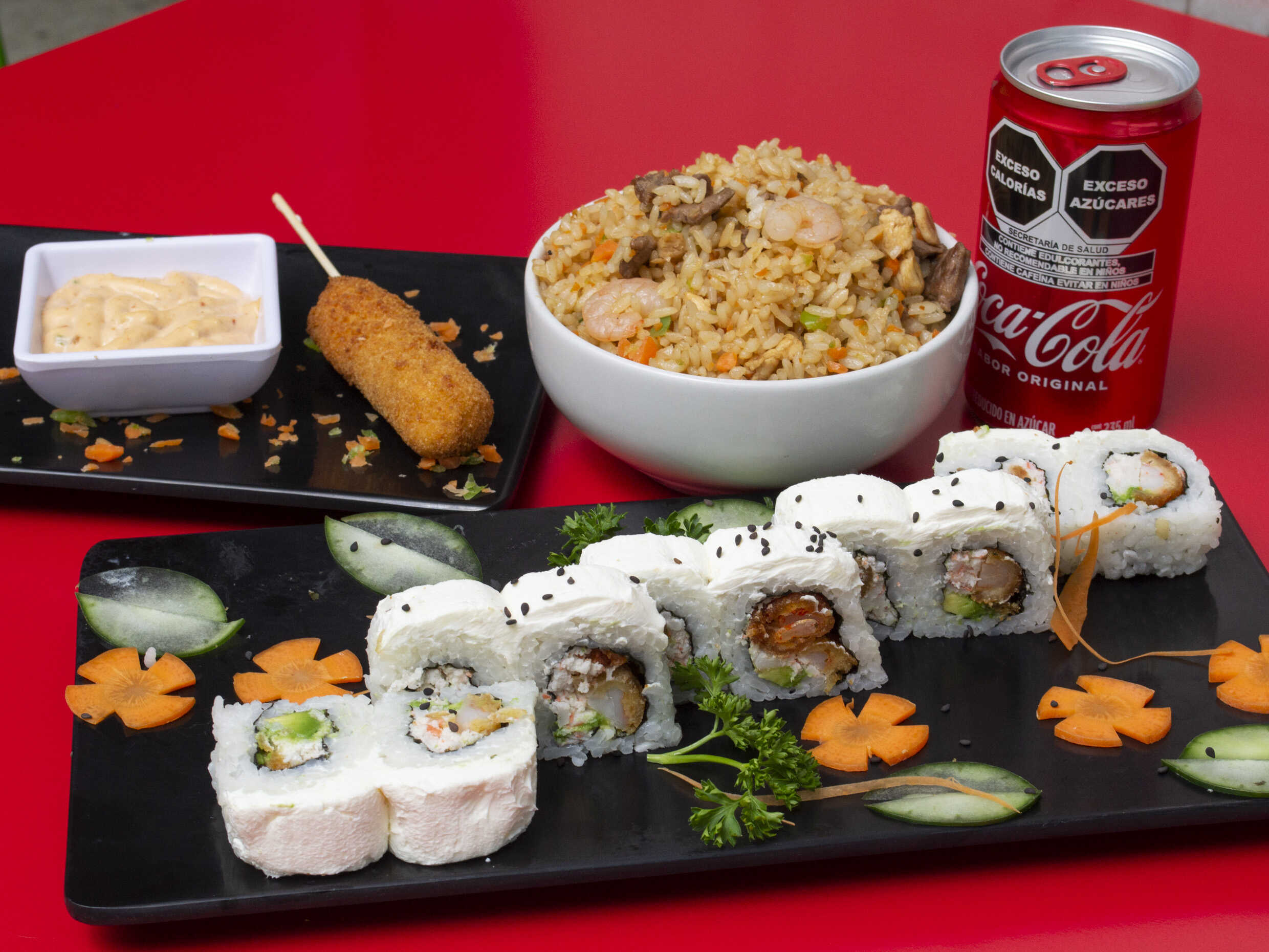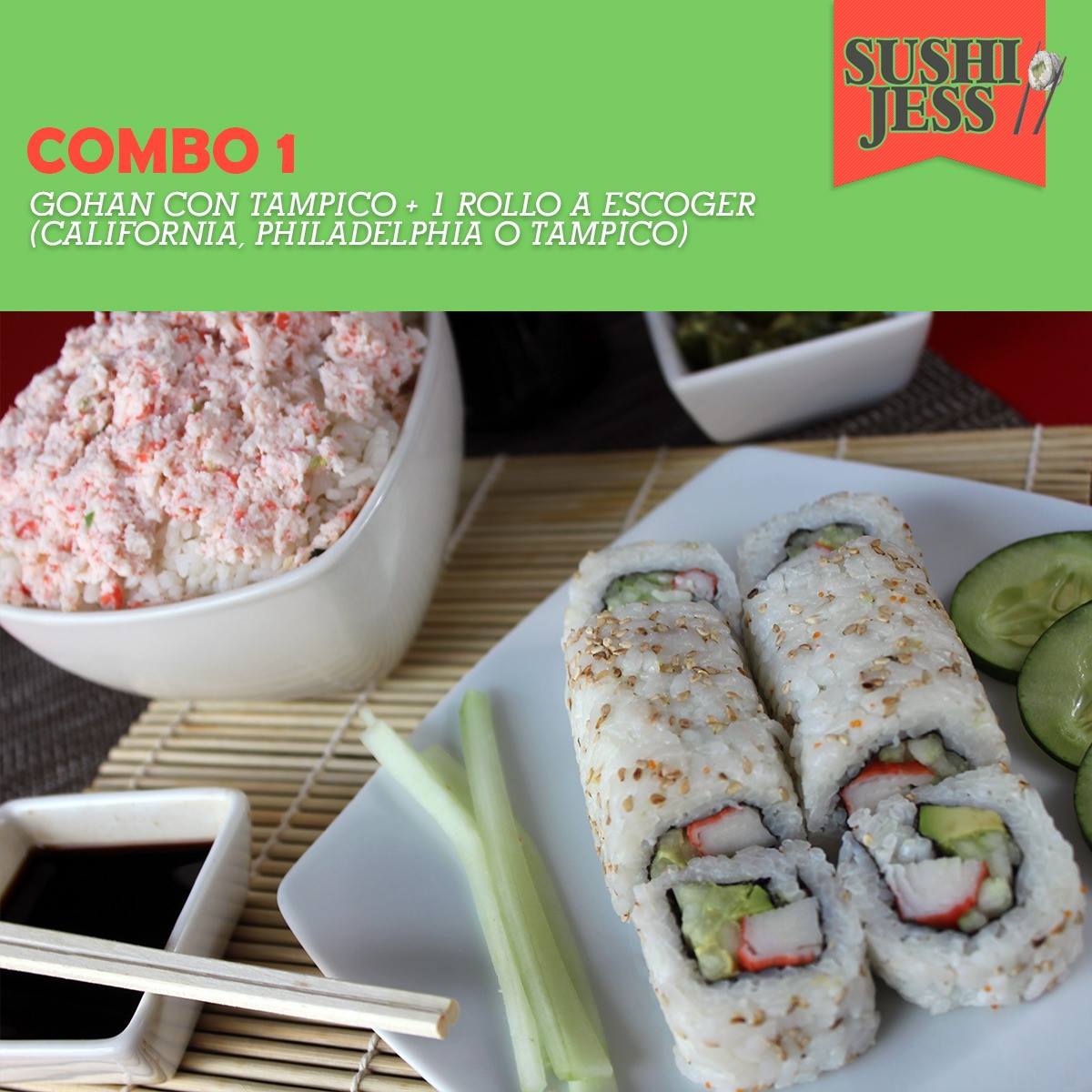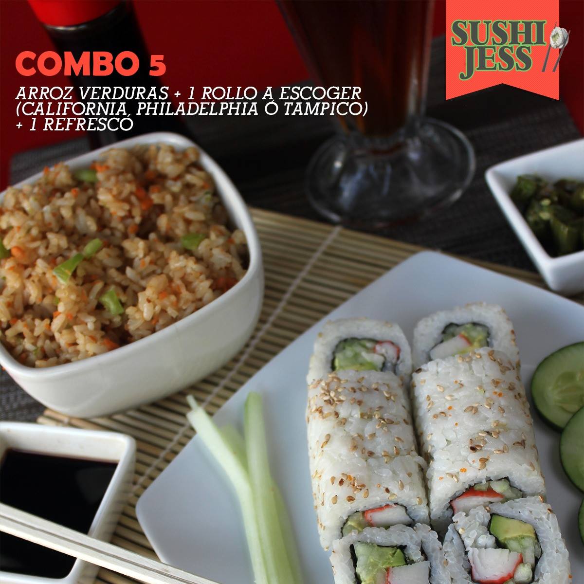Arroz verduras, 1 rollo a escoger ( California, Philadelphia o tampico). refresco de lata