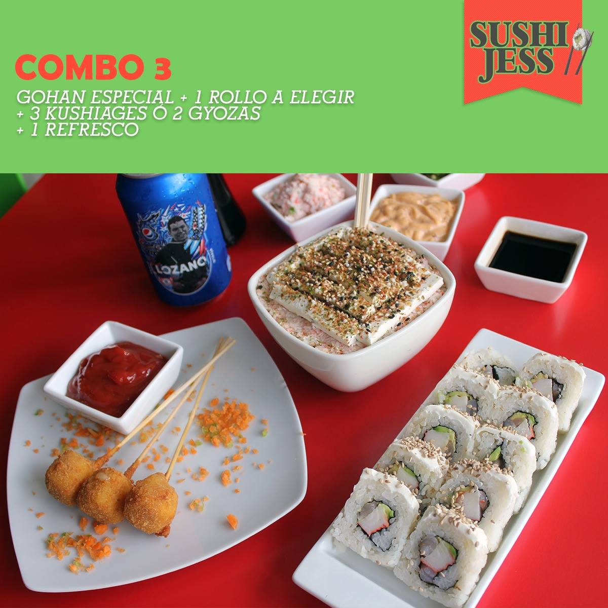Arroz gohan especial, 1 rollo a tu elección ( 3 kushiage o Gyozas)y 1 refresco.