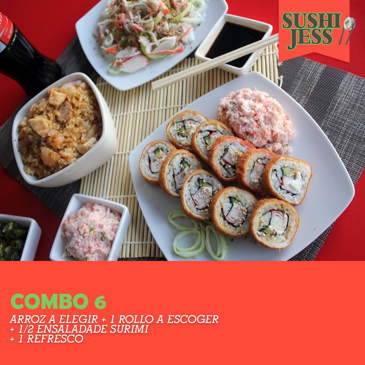 Arroz a escoger, 1 rollo a escoger ( media ensalada) refresco de lata.