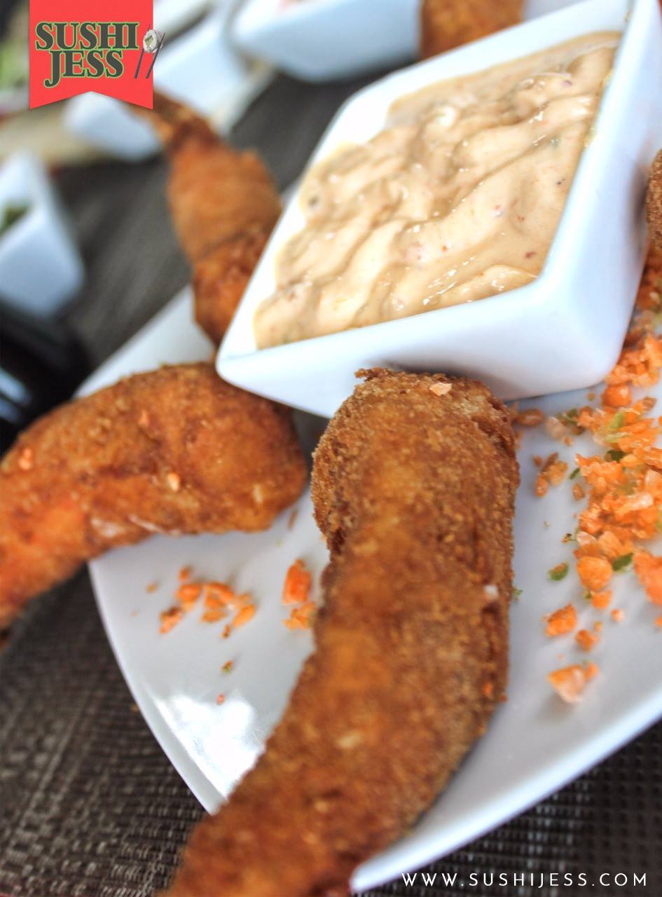Camarón,salmón empanados, queso y aderezo de chipotle.