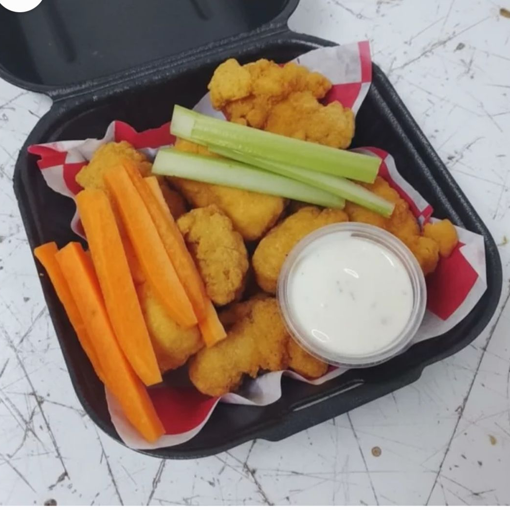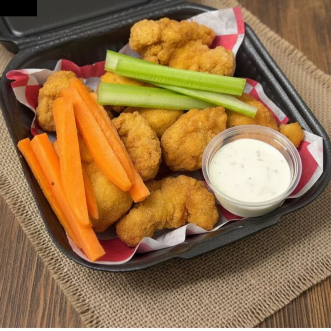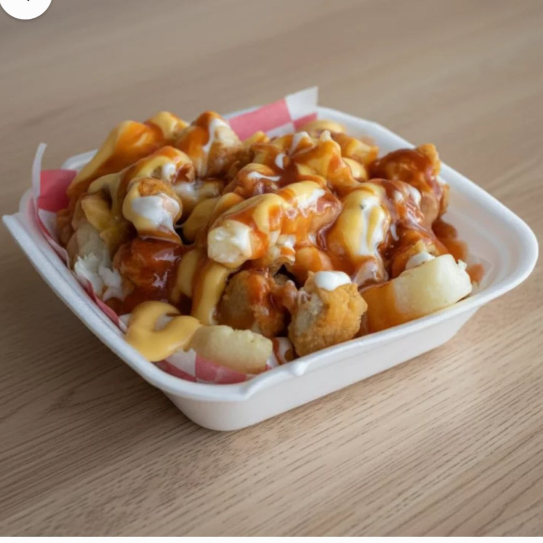 Boneless mas papas, bañado con aderezo, queso amarillo y salsa a elegir, Buffalo, BBQ o habanero