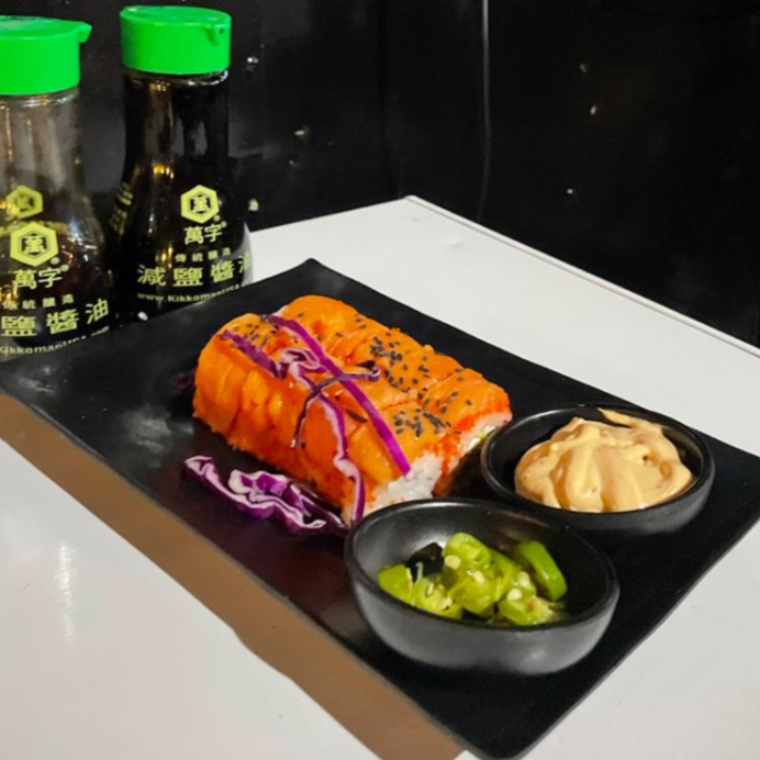 Por dentro queso crema, aguacate, camarón empanizado, alga por fuera y acompañado de aderezo chipotle